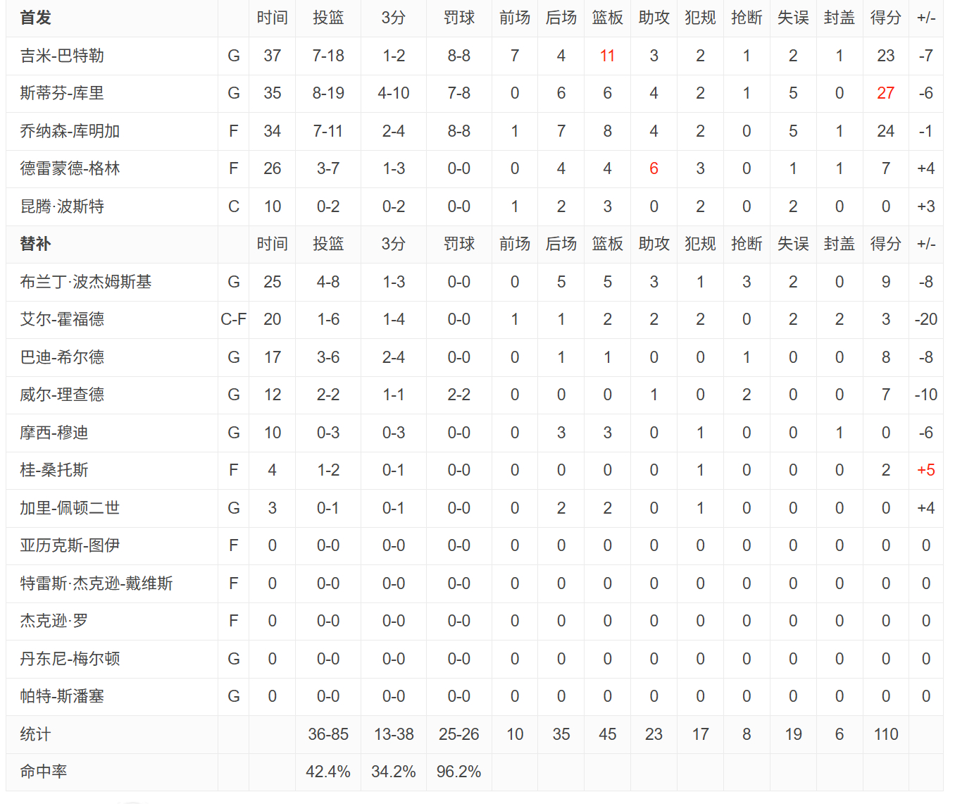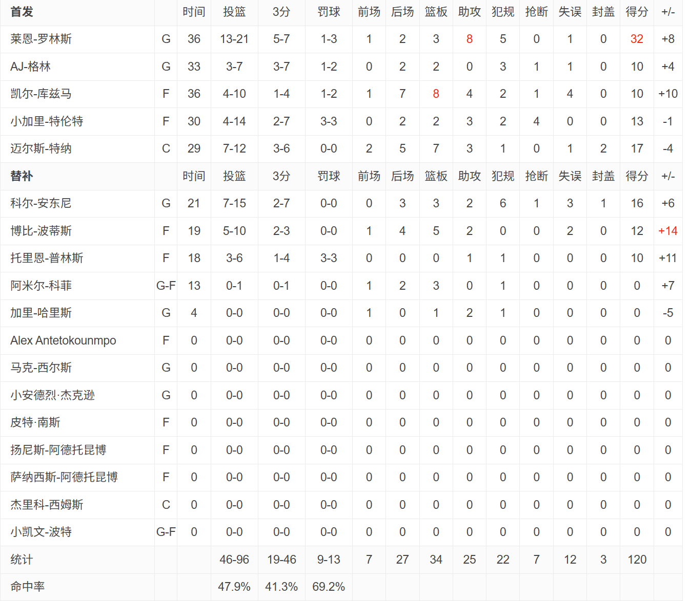 雄鹿主场120-110战胜勇士取得两连胜,罗林斯32分8篮板。