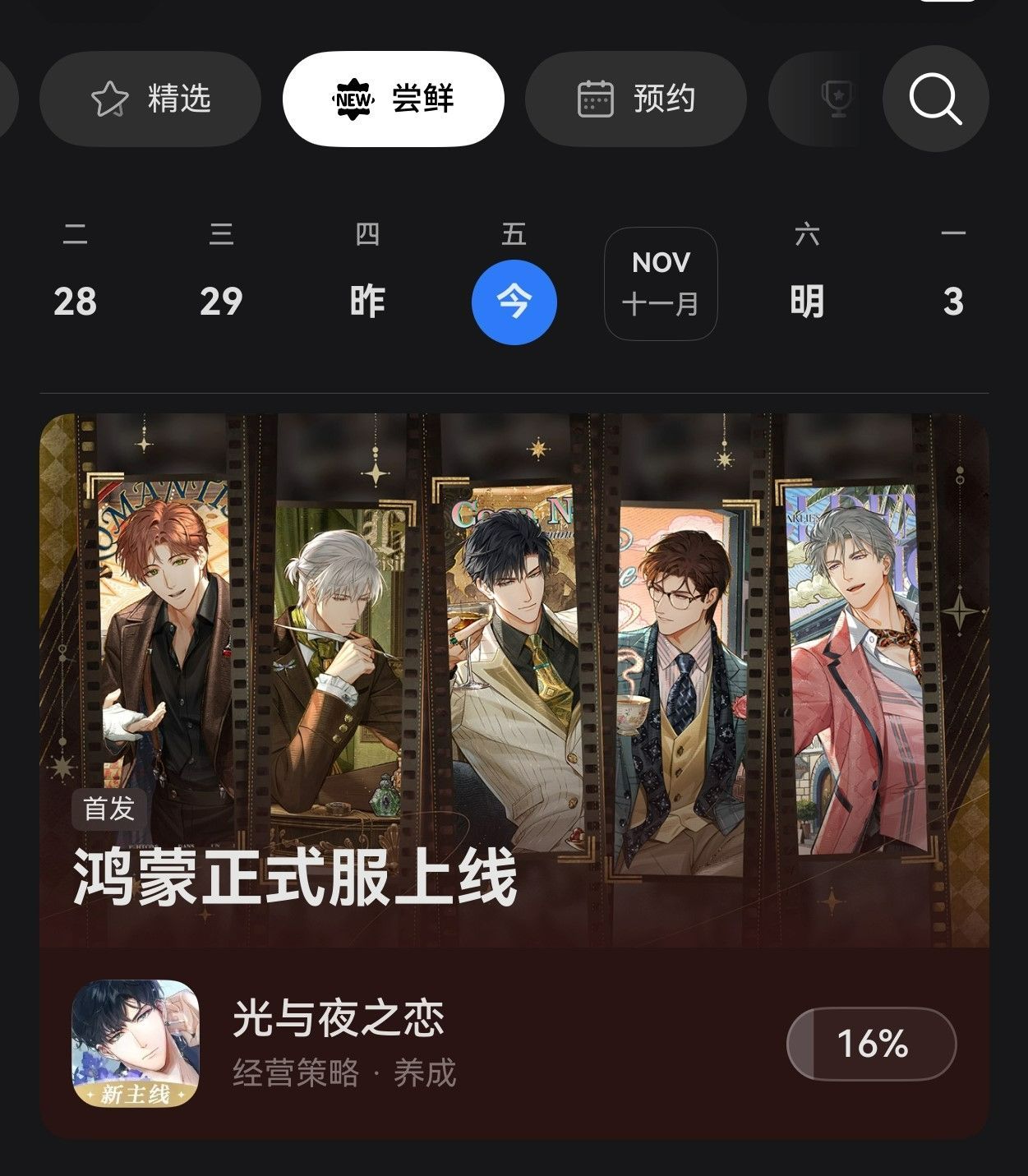 最近鸿蒙游戏发展势头很猛,今早华为游戏中心上架了光与夜之恋 鸿蒙正式服