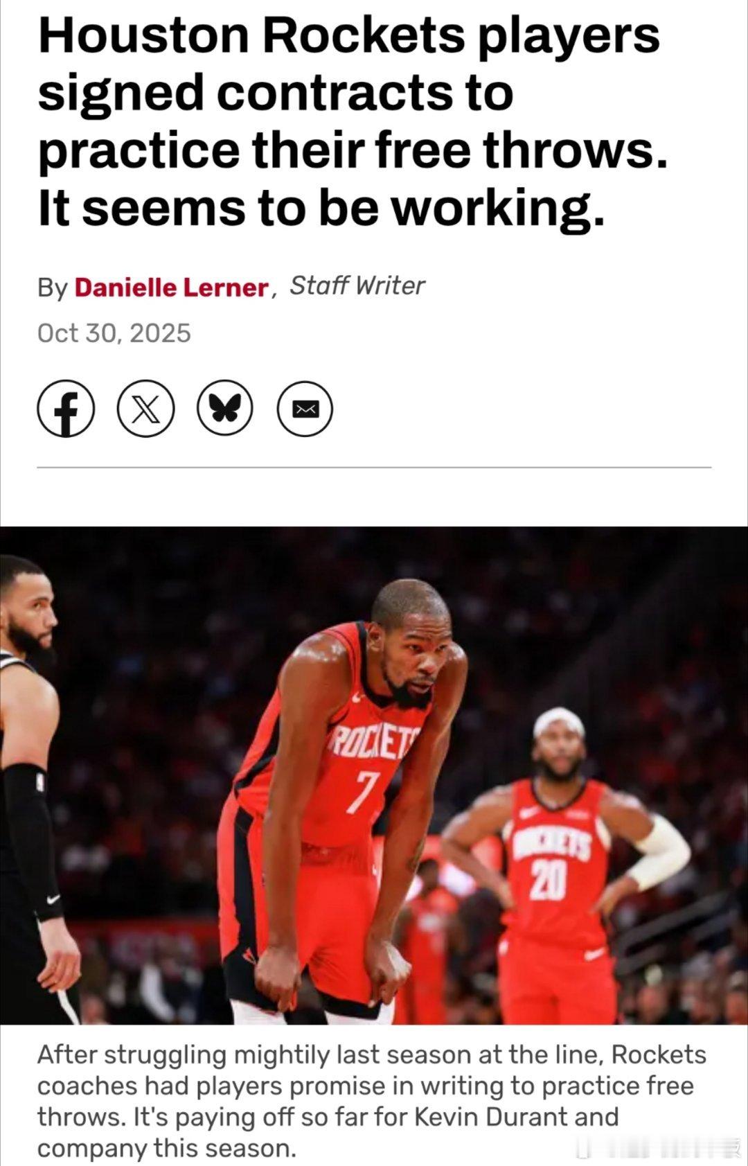 火箭队记报道,本赛季每名火箭球员都与球队签署了与罚球挂钩的协议,根据个人目标量身定制罚球计划。例如申京每次训练需连续两次达成5罚5中,小贾巴里-史密斯25罚至少命中23球,卡佩拉需完成50次罚球🎯