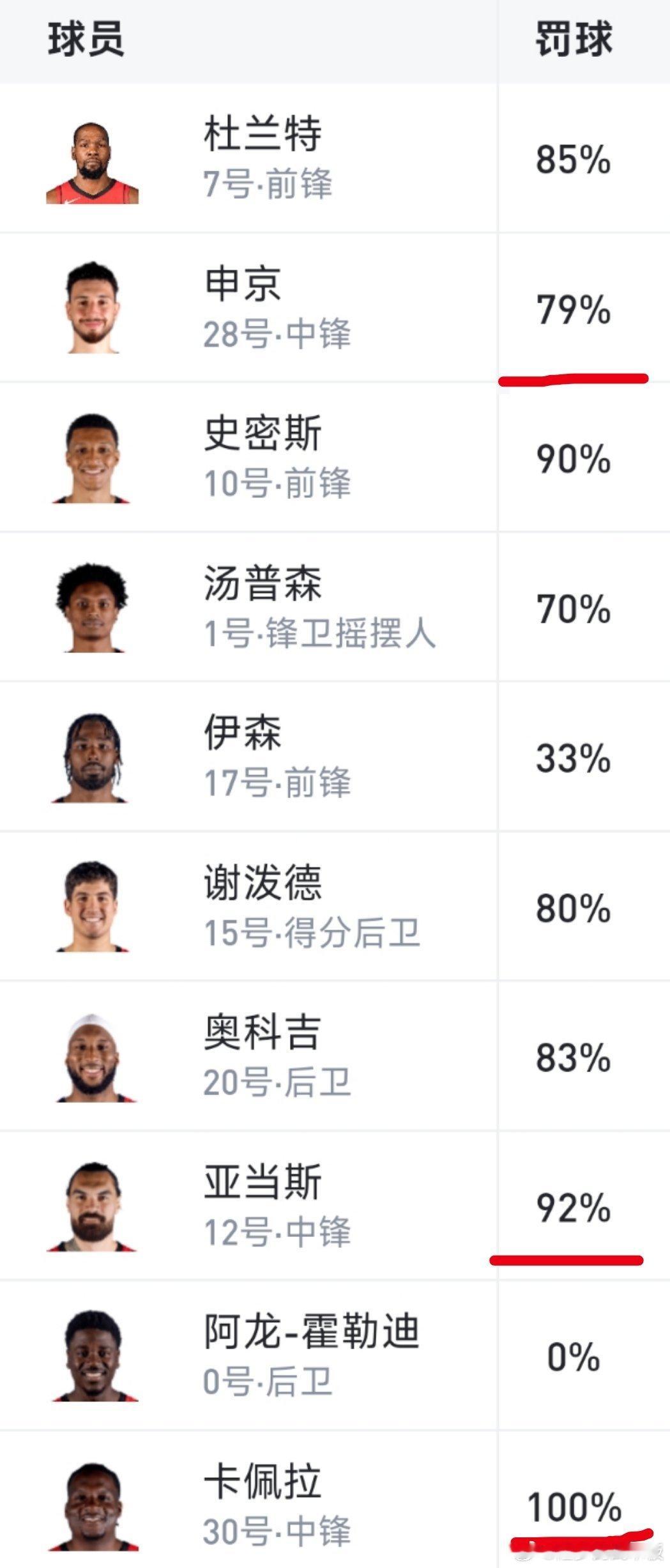 赛季至今,在小样本统计下,火箭内线球员罚球命中率显著提升: 申京79%,亚当斯92%,卡佩拉100%。新赛季篮不住