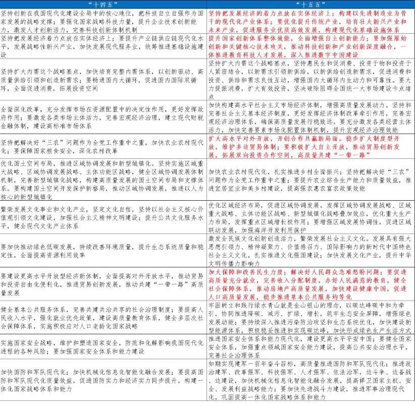 图1 “十二五”至“十五五”主要目标一览 图2 “十四五”与“十五五”主要目标一览 未来几年大家的资产配置和持仓布局,一定不要忽视“十五五”规划的重要性! 简单划个重点,十五五建议稿重点强调的:发展先进制造业、科技自立自强、扩大内需、民生保障等。