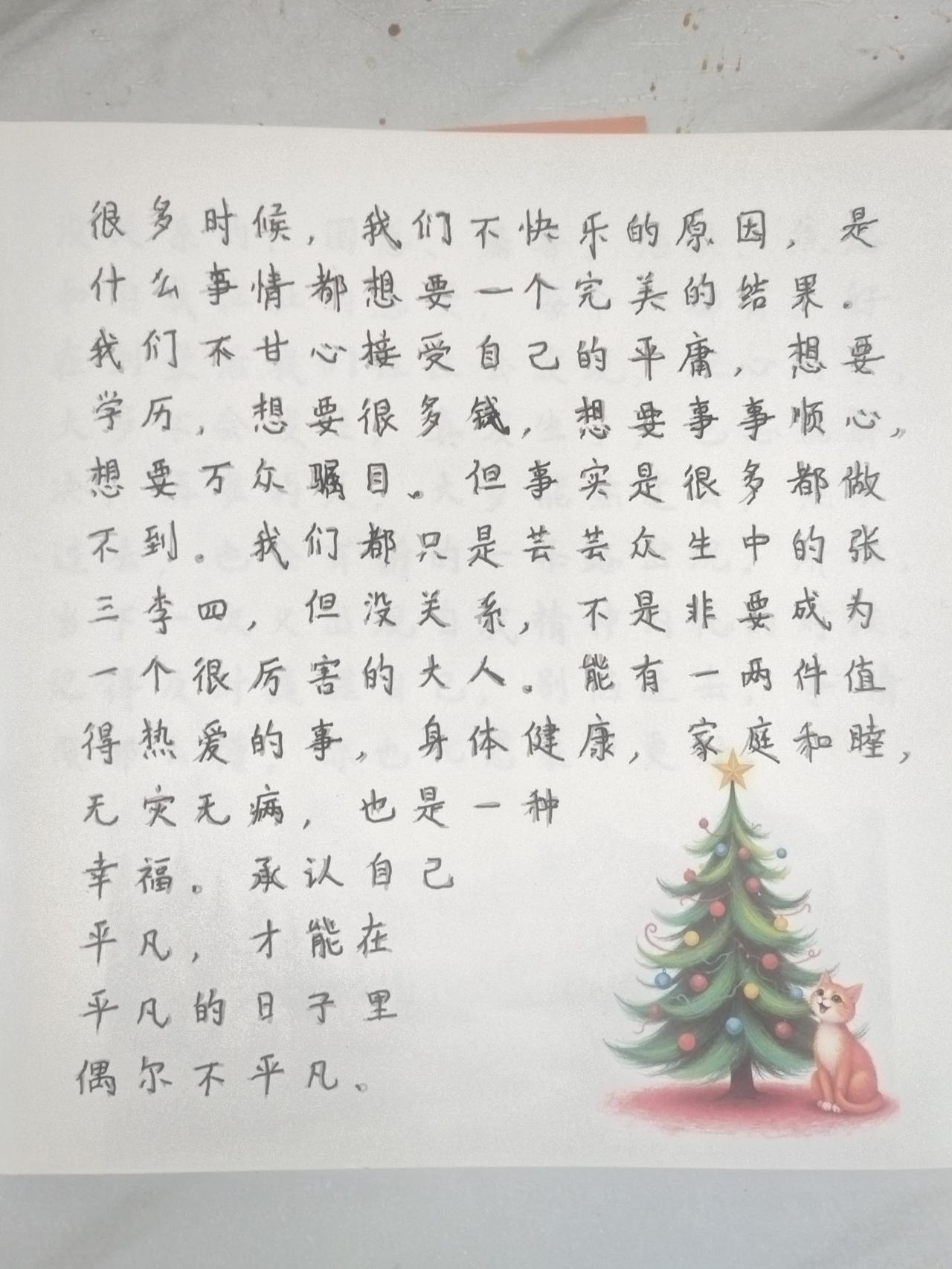 别让“完美执念”偷走快乐,平凡日子里的小确幸才是生活真谛 很多人总在追逐“完美结果”的路上焦虑不已:渴望高学历、大财富,盼着事事顺心、万众瞩目,却在求而不得中陷入不快乐。 可我们终究是芸芸众生里的普通人,没必要执着于成为“厉害的大人物”。能有一两件热爱的事填充生活,拥有健康的身体、和睦的家庭,无灾无病地过好每一天,这本身就是一种踏实的幸福。 承认平凡,不是躺平,而是在接纳自己的底色后,更能在烟火日常里捕捉到闪光瞬间——或许是周末为自己做的一顿家常菜,或许是和家人散步时的闲话家常,或许是沉浸在爱好里的专注时刻……这些平凡日子里的“小确幸”,恰恰是生活最真实的暖意。 别让对“不平凡”的执念,错过了平凡日子里的“偶尔不平凡”呀~