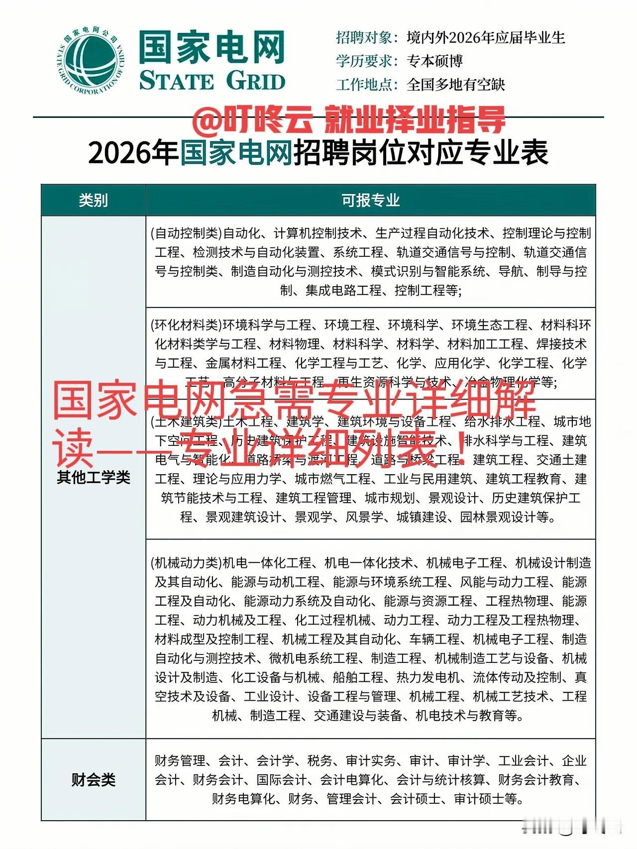 招这108个专业!国家电网招聘需要哪些专业?本文专业解读国家电网岗位招聘专业汇总揭秘!专业对口第一,学历第二!专业不对口,费劲努力都是白费!所以说我们的志愿填报就想清楚,将来的职业规划!招聘就是一个萝卜一个坑,一个好专业,顶一个211,985。想要了解更多职业规划指导,欢迎关注@叮咚云 。速速围观揭秘详细内容![来看我][来看我][点亮平安灯][点亮平安灯][招财进宝][招财进宝] 国家电网工作前景如何