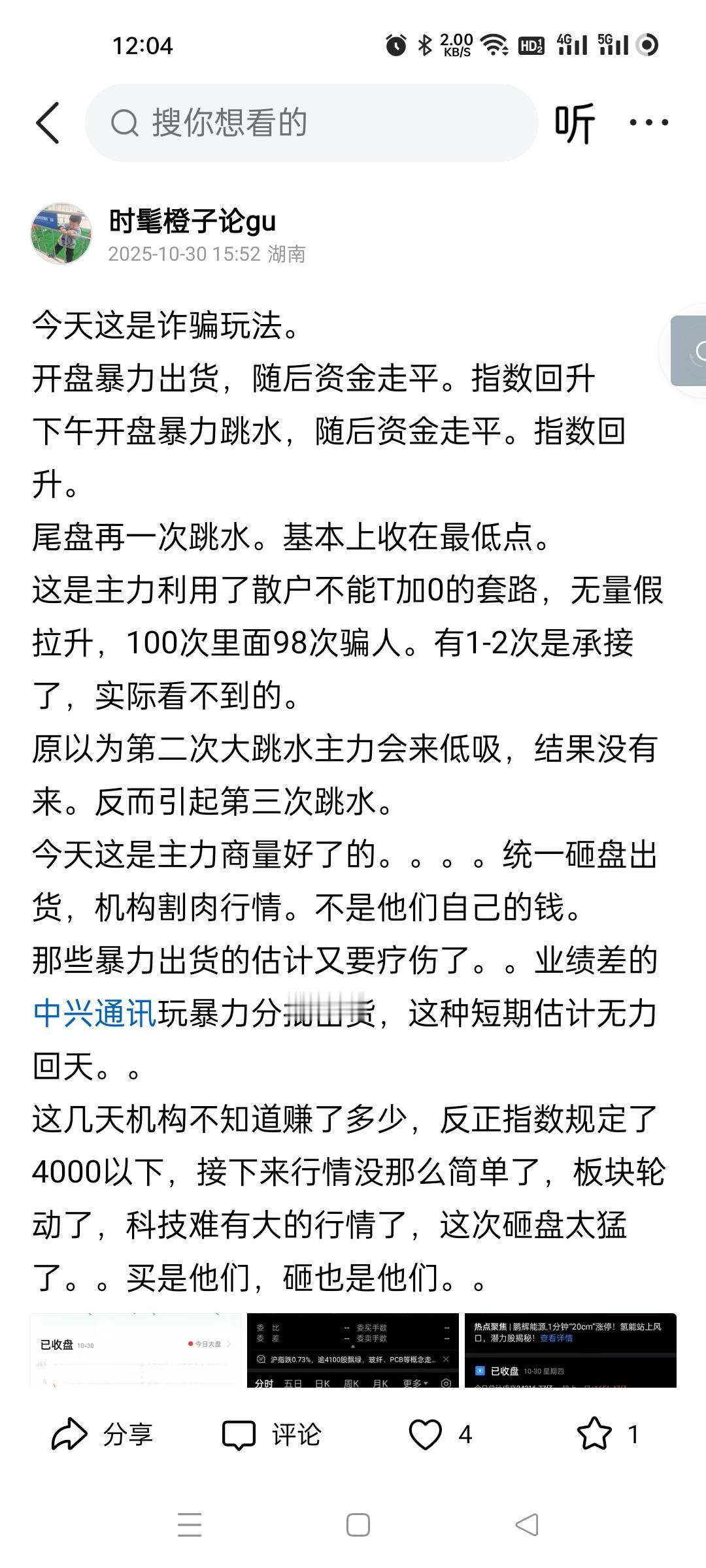 今天个股还可以,资金继续暴力砸盘科技线,科技第二波才动一下又破位了。 疯狂的基金,暴力玩法,一致性砸盘。 资金拉上去反向做空。比如工业富联之类,cpo之类,消费电子之类,等等,业绩好坏都是出货。 科技线年底估计很难再突破了,二波太弱了。。。。谨慎参与啊,尤其破位暴力出货的个股。 今天资金换了战场,资金这一次看看切换程度如何。连白酒都被拉起来了。 会玩是真会玩。。。资金的天下。暴力波动的市场,完全就是纯炒作的市场。。投机市场。还不认可吗?