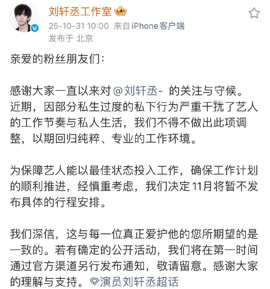 刘轩丞工作室暂不发布11月行程刘轩丞方因私生暂不发布具体行程刘轩丞方因私生暂不发布具体行程!刘轩丞工作室发文:“近期,因部分私生过度的私下行为严重干扰了艺人的工作节奏与私人生活,我们不得不做出此项调整,以期回归纯粹、专业的工作环境。
