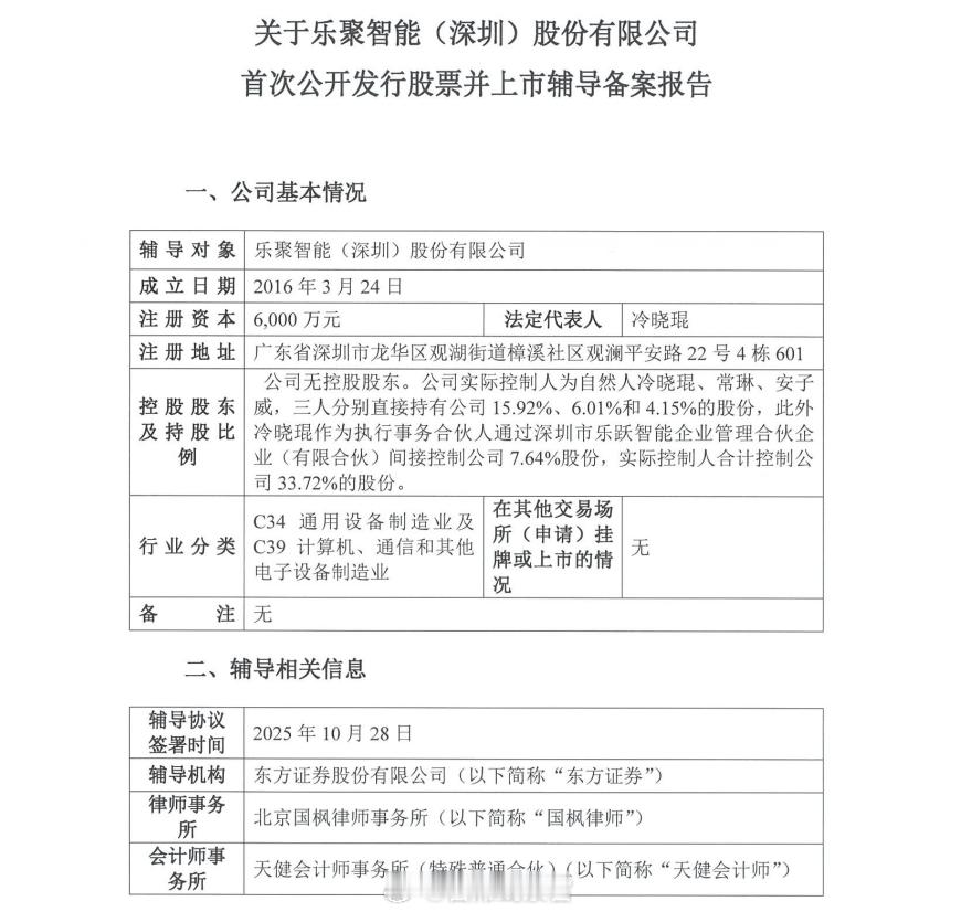 乐聚机器人母公司乐聚智能(深圳)股份有限公司在深圳证监局办理辅导备案登记,拟首次公开发行股票并上市,辅导券商为东方证券。