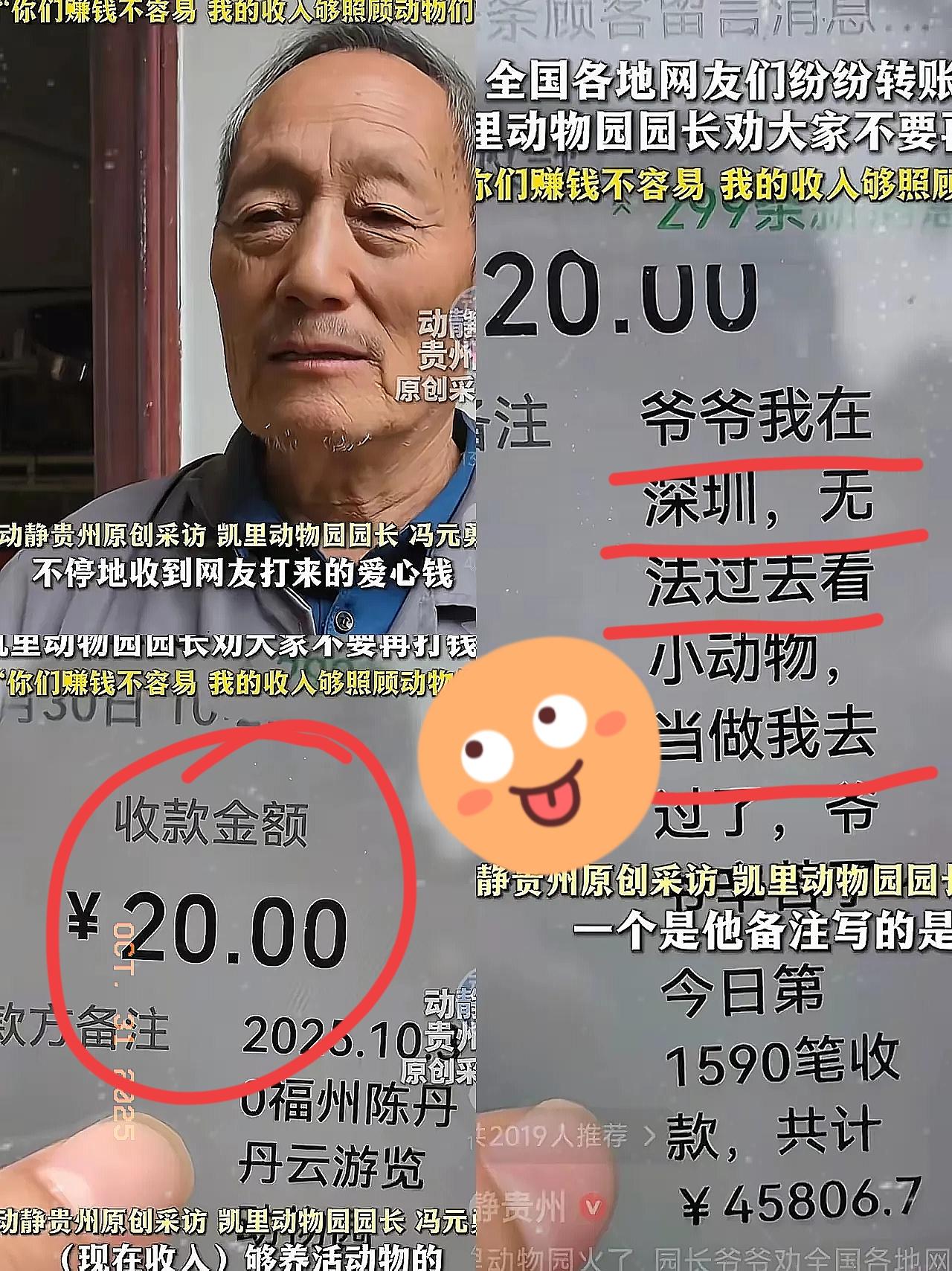 “彻底解释不清了!” 凯里动物园园长因为突然爆火,被网友把他的收款码发到网上,全国网友都在往他账户转钱,每次20元,因为他的动物园门票就是20元 谁能想到,贵州深山里一个要爬山路才能找到的动物园,会靠“拒绝钱”火出圈? 70岁的冯元勇爷爷守着这个3500平米的园子十年,售票、喂饭、打扫全是他一个人,门票20块从没涨过,自己贴退休金也要把老虎、棕熊喂得膘肥体壮! 网友偷偷发了他的收款码,全国人跟风转20块“云买票”,备注全是“给小动物的口粮”! 可爷爷急了,反复喊停:“你们挣钱不容易,现在够养它们了!” 这哪是收门票,分明是善良在互相奔赴! 没有噱头,没有炒作,爷爷用最笨的坚守换来了最暖的支持,连政府都来修路人了! 其实我们爱这个动物园,根本不是为了看动物,而是想护住这份不掺假的真诚! 你说,这份双向的善意,是不是比任何风景都动人?