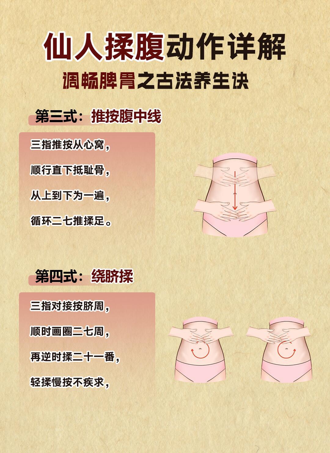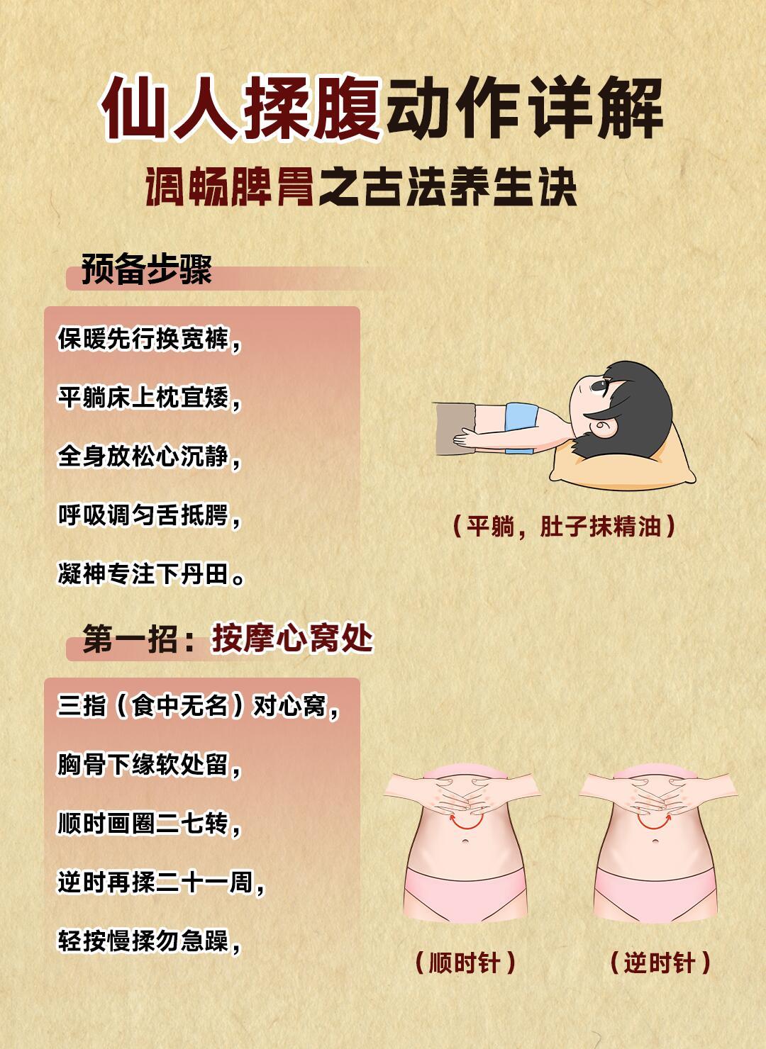 中式养生秘籍之仙人揉腹篇,请珍藏🤭解锁中式养生新搭配!每天早上练一遍八段锦,晚上睡前花几分钟揉腹,就这么坚持了14天。现在明显感觉气血足了,脾胃运化也顺了,连走路都觉得比以前轻快。附上练习图,感兴趣的朋友一起揉起来~仙人揉腹中医养生