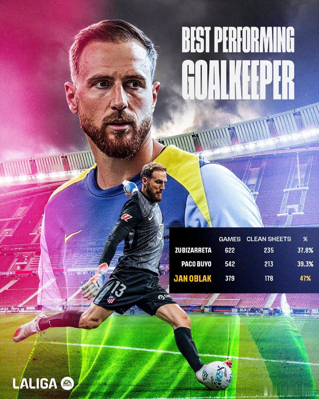 【钢的门】32岁的马竞门将奥布拉克完成第178次西甲零封,超越卡西利亚斯,成为西甲零封次数第3多的门将,仅次于213次零封的布约和235次零封的苏比萨雷塔。