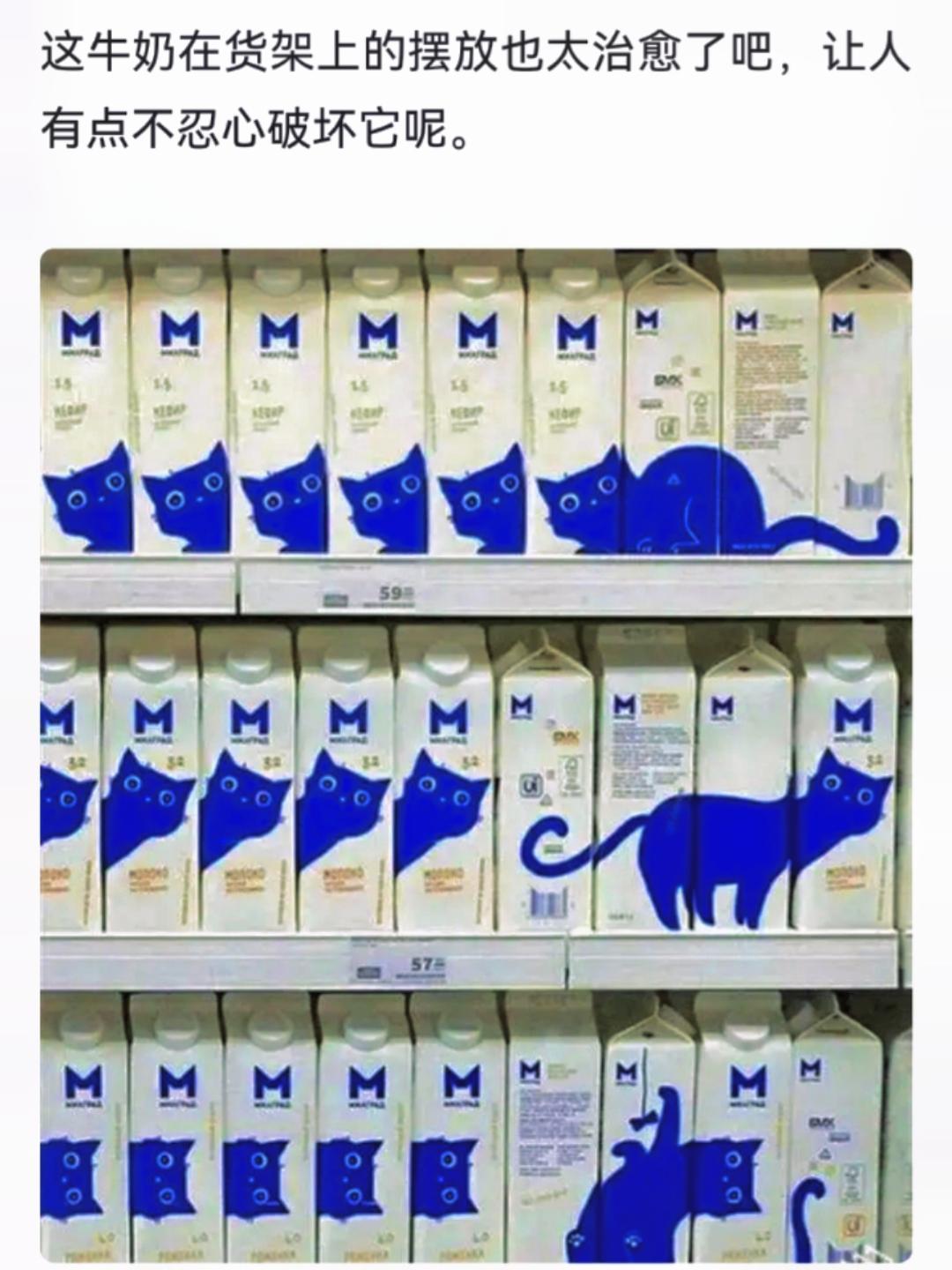 这牛奶在货架上的摆放也太治愈了吧,让人有点不忍心破坏它呢。