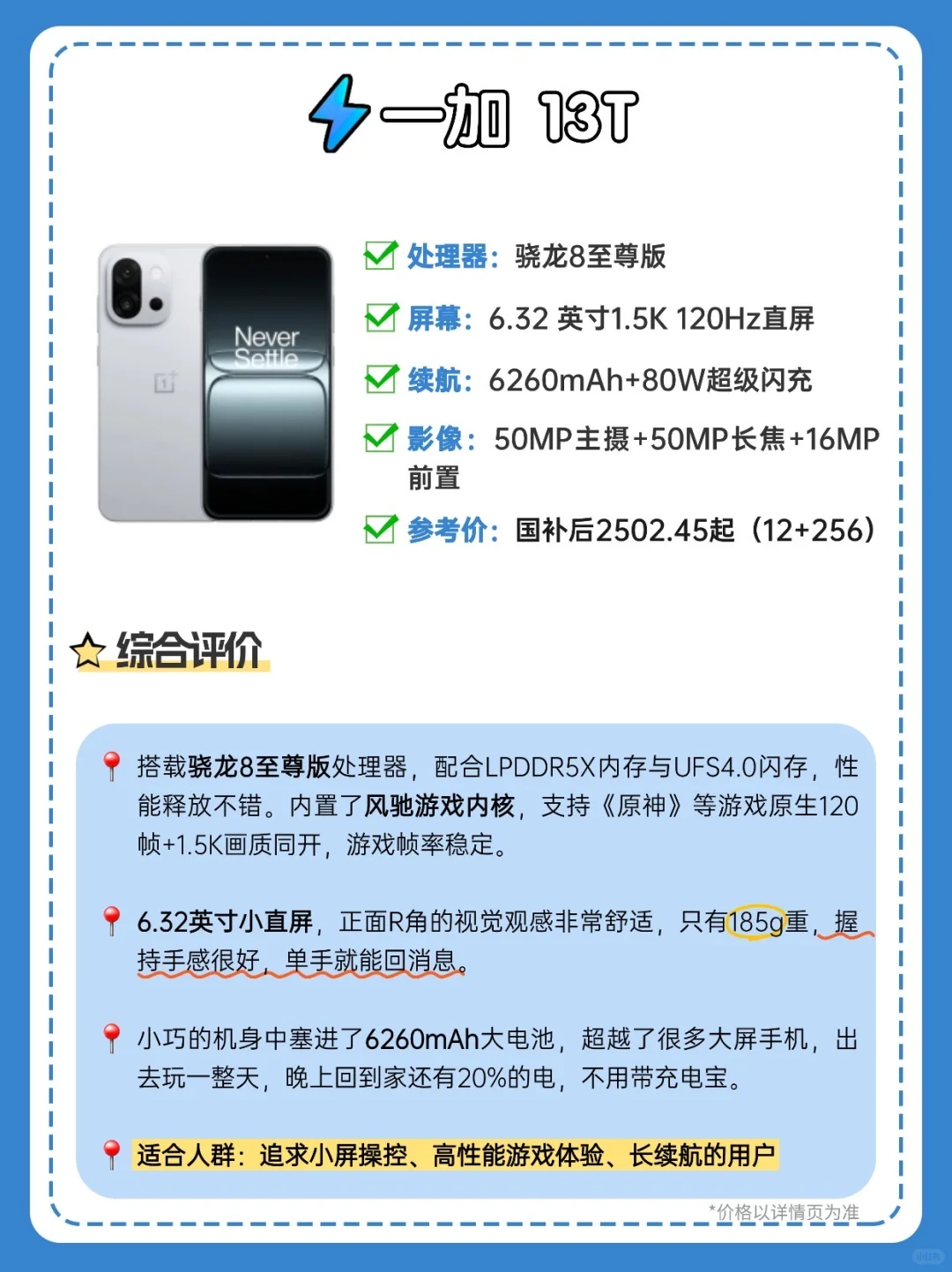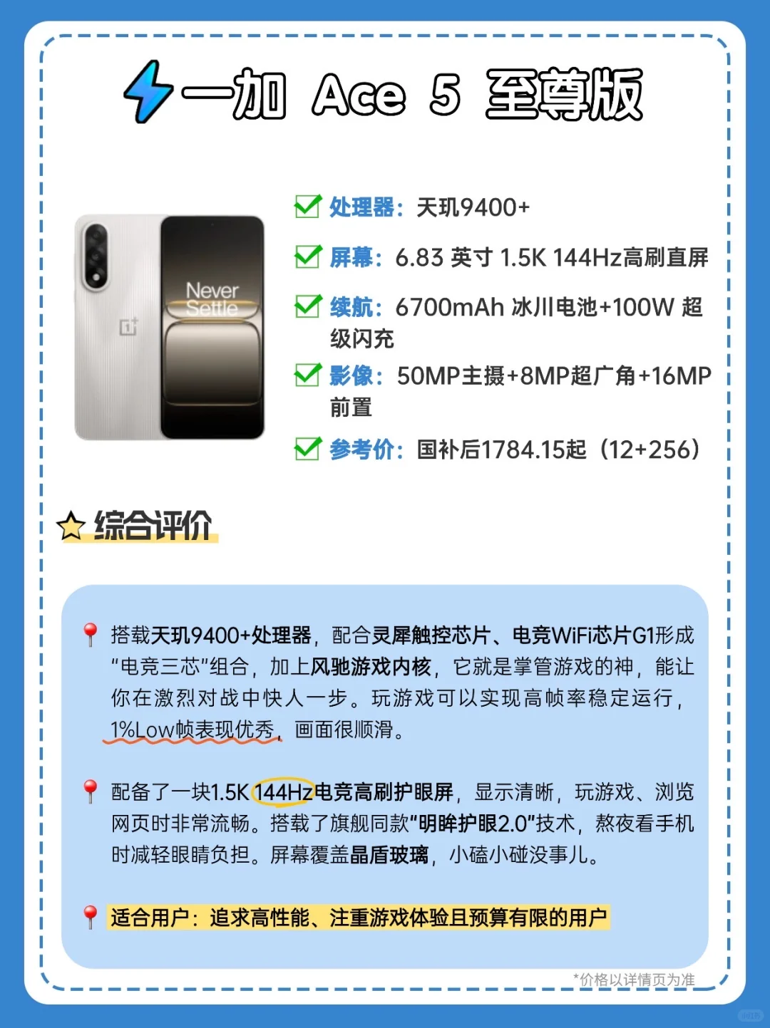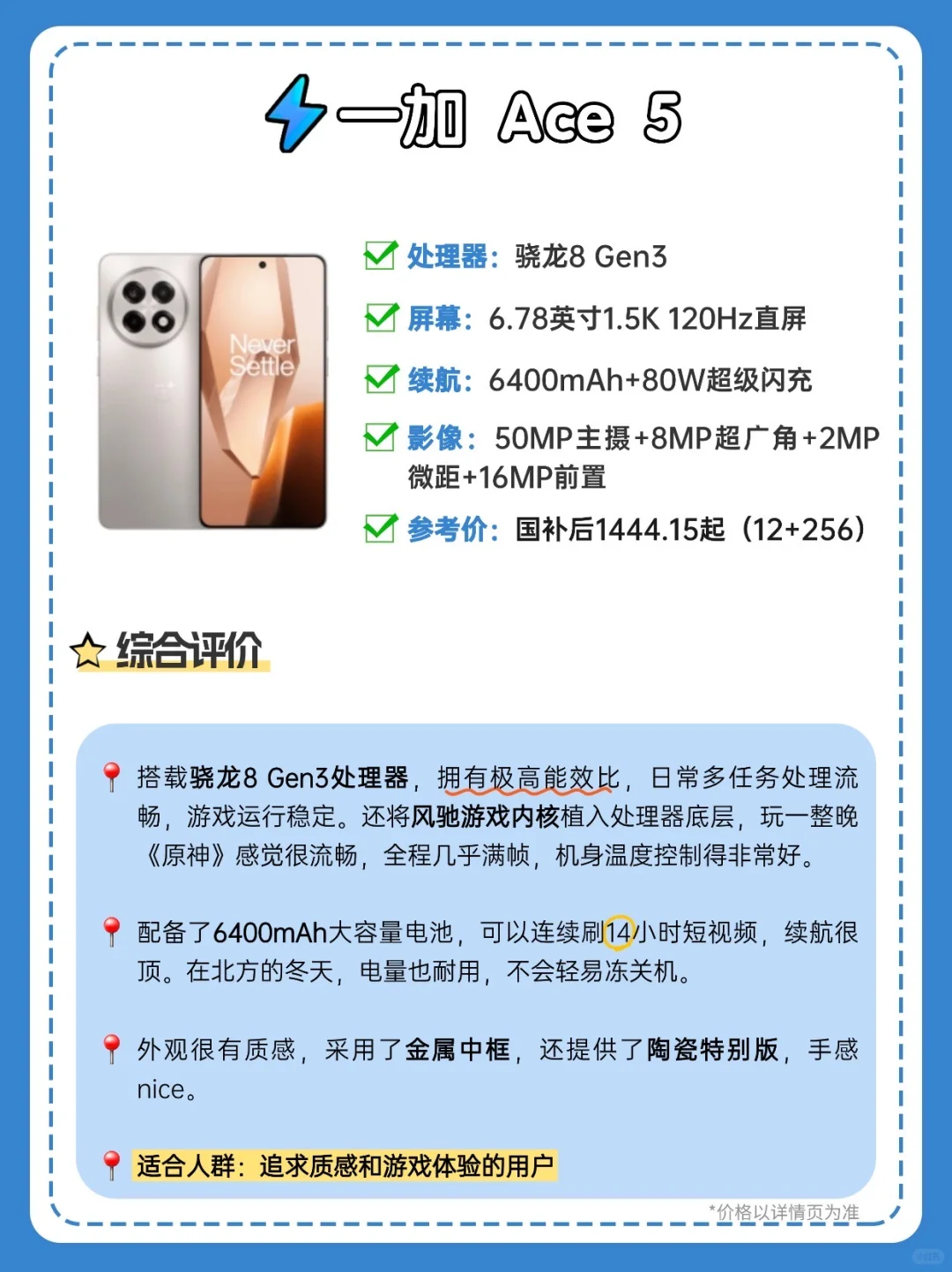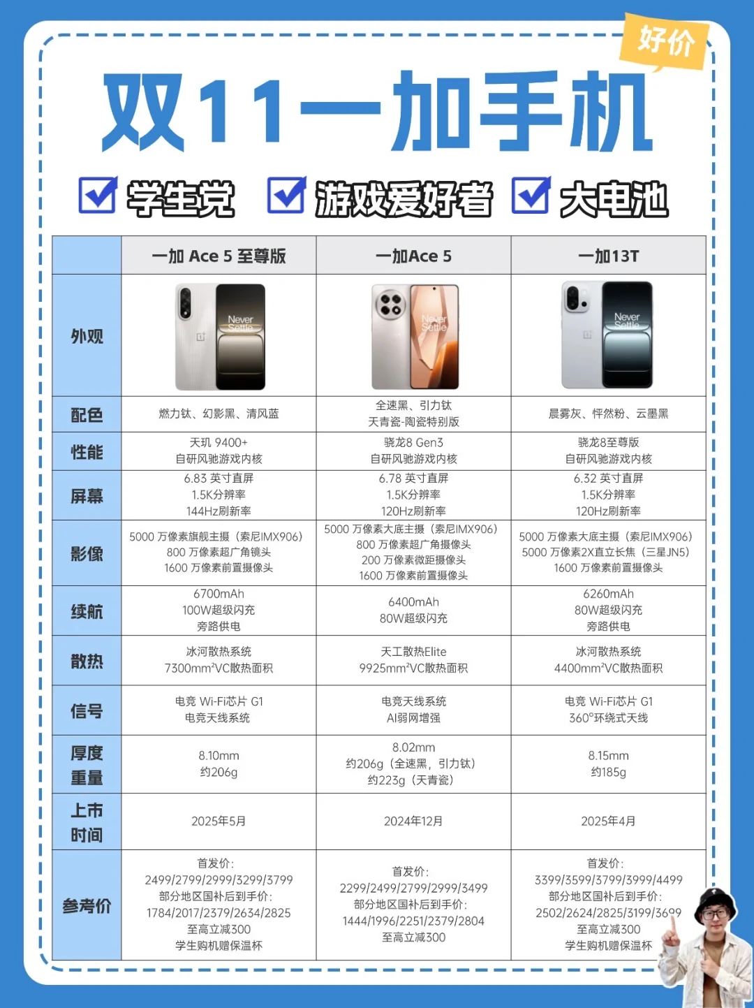 正好赶上双十一,打算换手机的看过来,这几款一加手机很适合打游戏,叠加国补后价格香麻了,不到2千就能拿下,非常适合学生党。 📱一加 Ace 5 至尊版 到手价:1784起 搭载天玑9400+处理器,配合灵犀触控芯片、电竞WiFi芯片G1,形成“电竞三芯”组合,能让你在激烈对战中快人一步。玩游戏可以实现高帧率稳定运行,1%Low帧表现优秀,画面很顺滑。 配备了一块1.5K 144Hz电竞高刷护眼屏,有旗舰同款“明眸护眼2.0”技术,熬夜玩游戏时减轻眼睛负担。 适合用户:追求高性能、注重游戏体验且预算有限的用户(学生买这款手机送保温杯哦) 📱一加 Ace 5 到手价:1444起 搭载骁龙8 Gen3处理器,拥有极高能效比,日常多任务处理流畅,游戏运行稳定。 还将风驰游戏内核植入处理器底层,玩一整晚《原神》感觉很流畅,全程几乎满帧,机身温度控制得非常好。 配备了6400mAh大容量电池,可以连续刷14小时短视频,续航很顶。在北方的冬天,电量也耐用,不会轻易冻关机。 外观很有质感,采用了金属中框,还提供了陶瓷特别版,手感nice。 适合人群:追求质感和游戏体验的用户 📱一加 13T 到手价:2502起 搭载骁龙8至尊版处理器,配合LPDDR5X内存与UFS4.0闪存,性能释放不错。内置了风驰游戏内核,支持《原神》等游戏原生120帧+1.5K画质同开,游戏帧率稳定。 6.32英寸小直屏,正面R角的视觉观感非常舒适,只有185g重,握持手感很好,单手就能回消息。 小巧的机身中塞进了6260mAh大电池,超越了很多大屏手机,出去玩一整天,晚上回到家还有20%的电,不用带充电宝。 适合人群:追求小屏操控、高性能游戏体验、长续航的用户(学生买这款手机送保温杯哦)