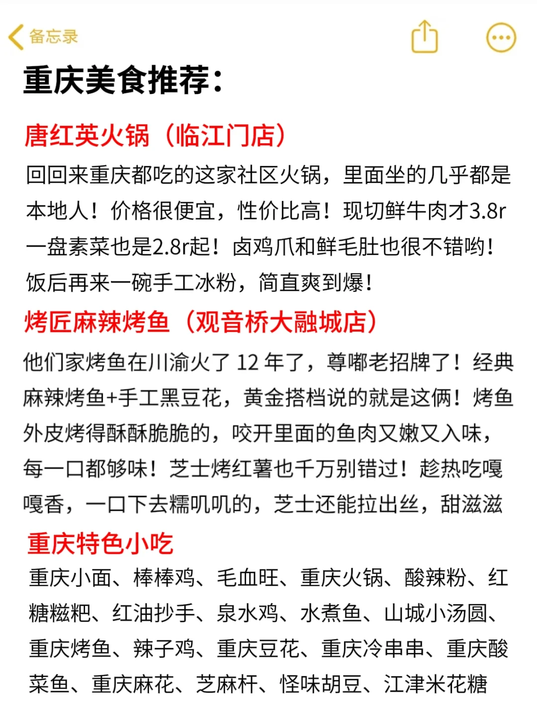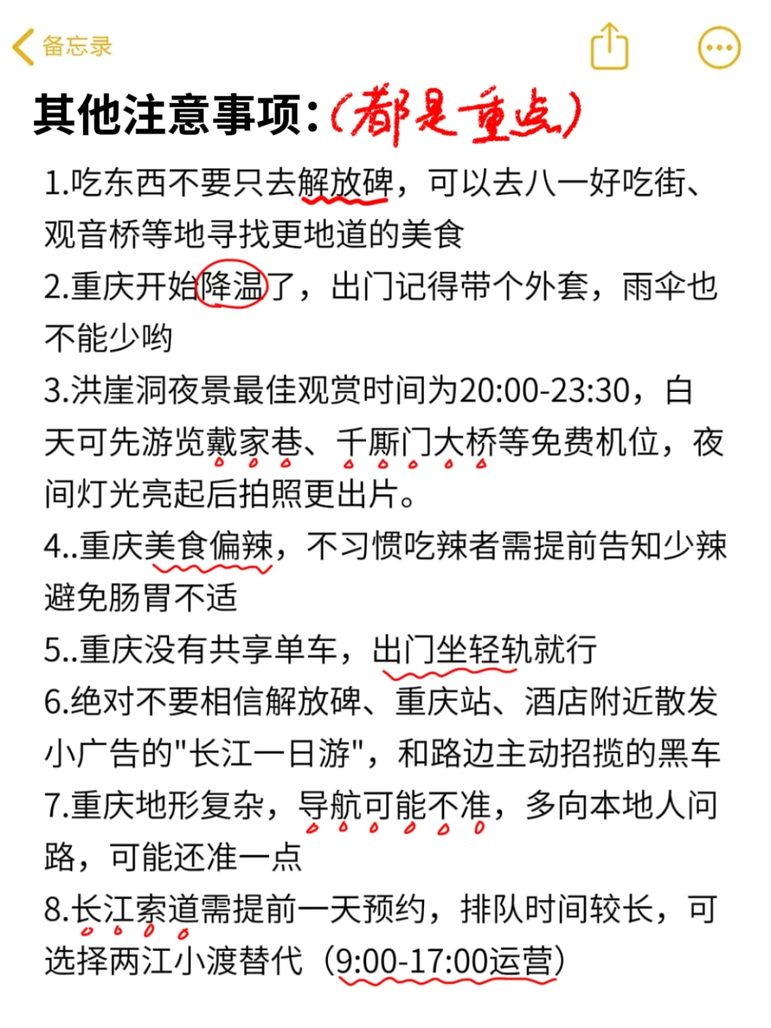 刚和闺蜜们从重庆回来 我们这场经历堪称是用💰砸出来的经验啊 所以连夜整理了这些容易踩的坑给大家!! 建议收藏码住反复观看📝 别走我们的老路喽🥹 - 🙅‍♀🙅‍♀🙅‍♀来重庆要注意的这12条,千万别踩坑 1⃣不要买颜色艳丽的金西梅,本地人都叫他哈儿果 2⃣不要买竹筒奶茶,不好喝只能拍拍照 3⃣在洪崖洞遇到送花的,直接拒绝,都是要给钱的 4⃣不要大白天的就去洪崖洞,里面就是卖东西的 5⃣不要和景区里面的铜人合影,都是收费的 6⃣切勿相信花钱带你走快速通道的,都是骗人的 7⃣解放碑附近保安推荐的火锅不要吃,又贵又坑 8⃣在重庆出行不建议乘坐公交,很容易堵车 9⃣在大剧院江滩遇到拍照的,一定要问好价格再拍 🔟不要信拉你去坐两江游的,价格很贵,想游览江景就去坐两江小渡 - 😍重庆必打卡美食 唐红英火锅(临江门店):特别划算的重庆火锅,天天都有人排队去吃 烤匠麻辣烤鱼(观音桥大融城店):火了12年的重庆烤鱼!经典麻辣烤鱼+手工黑豆花绝配! - 🔥香水- 更多旅游攻略- 重庆火锅重庆美食街重庆住宿重庆烤鱼打卡重庆三天两夜重庆穷游重庆旅游攻略重庆动物园游玩路线重庆重庆美食