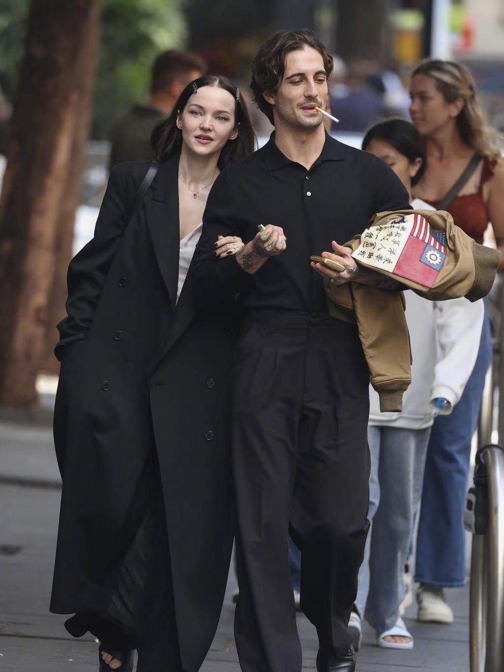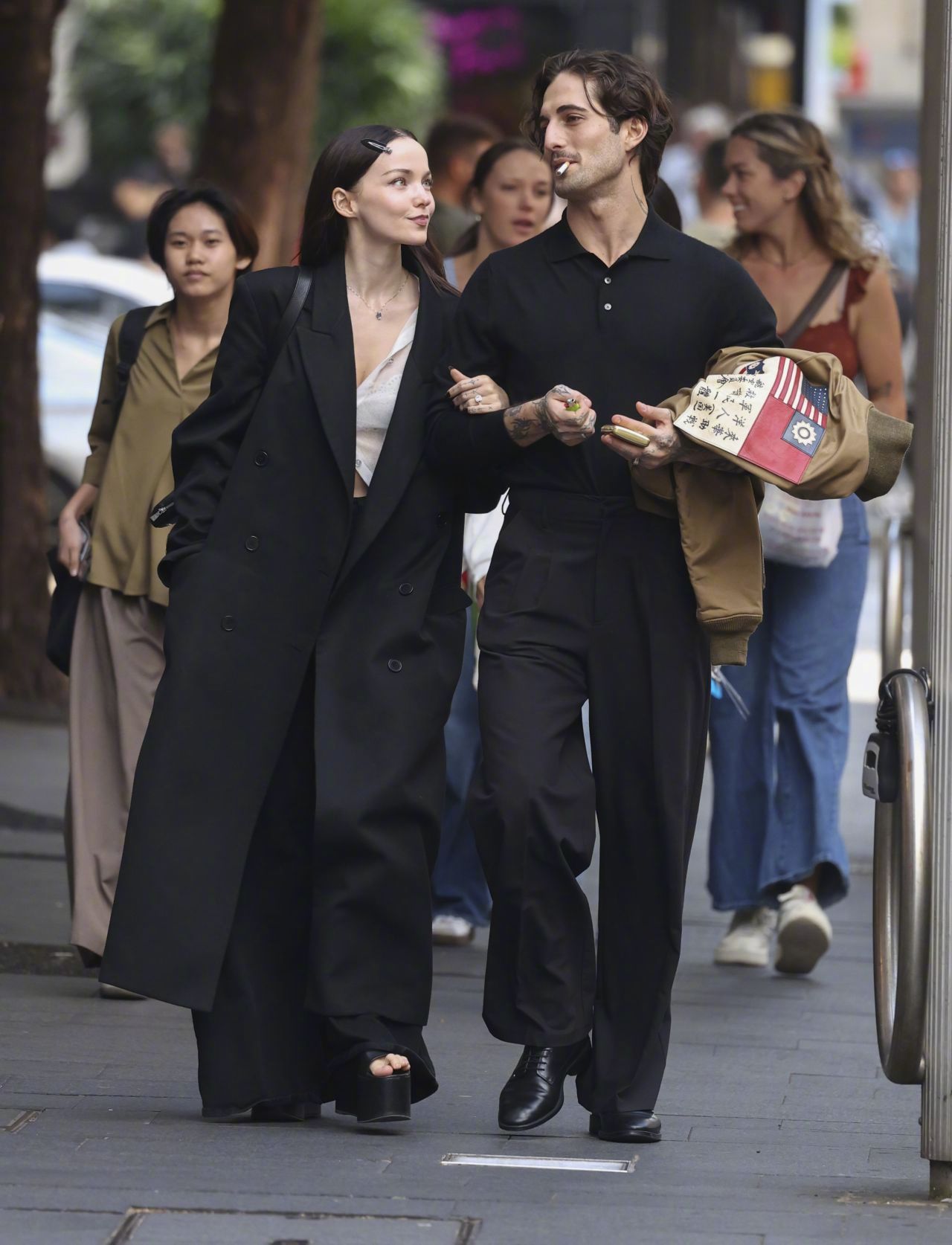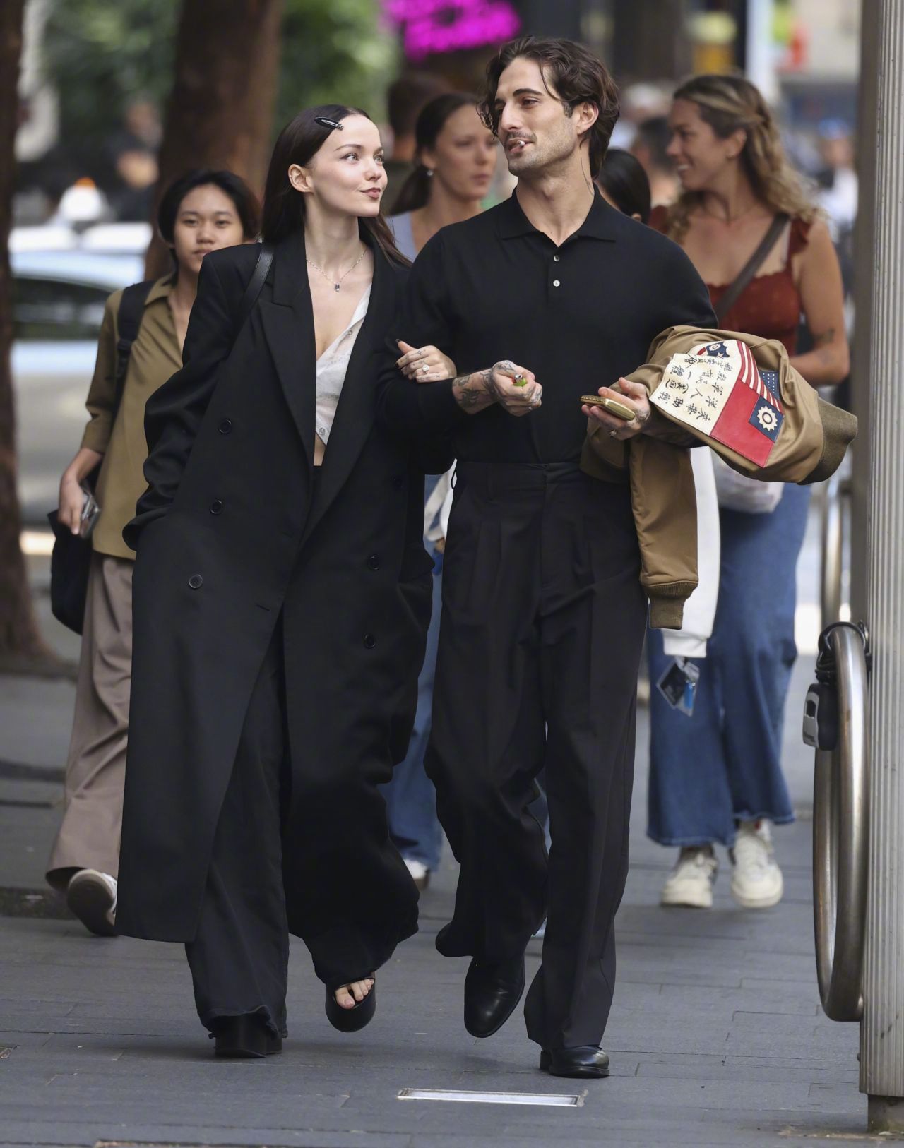 Dove Cameron身穿白色开衫和蕾丝内衣,外穿黑色大衣与男友Damiano David现身悉尼街头,佩戴的是Arriga 项链。据TMZ报道,29 岁的Dove与26 岁的Maneskin音乐人Damiano 交往两年后订婚。街拍中可看到Dove 的大钻石订婚戒指。 米拉服饰解析