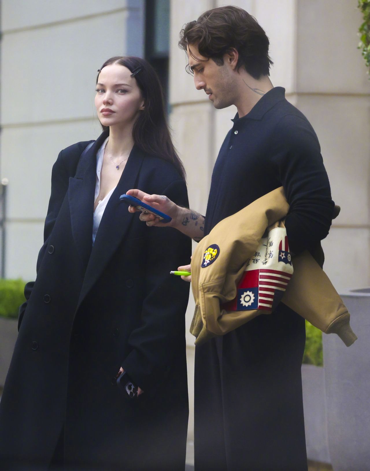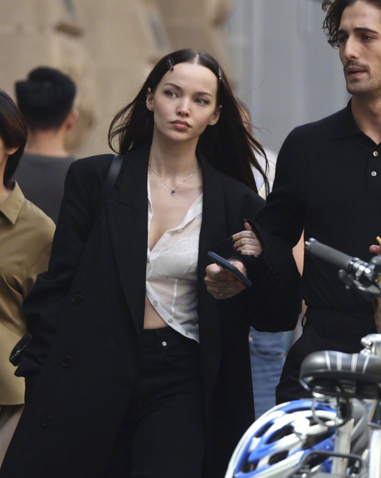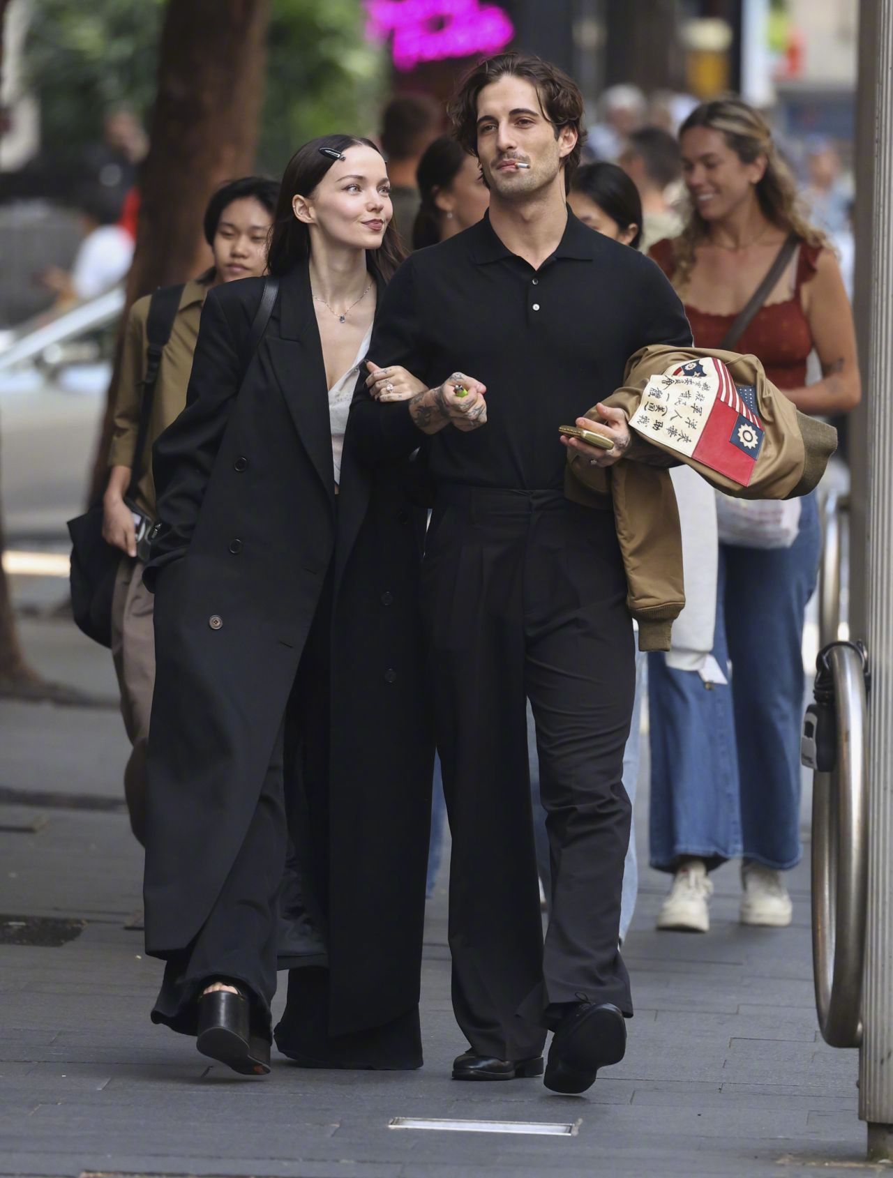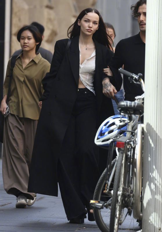 Dove Cameron身穿白色开衫和蕾丝内衣,外穿黑色大衣与男友Damiano David现身悉尼街头,佩戴的是Arriga 项链。据TMZ报道,29 岁的Dove与26 岁的Maneskin音乐人Damiano 交往两年后订婚。街拍中可看到Dove 的大钻石订婚戒指。 米拉服饰解析