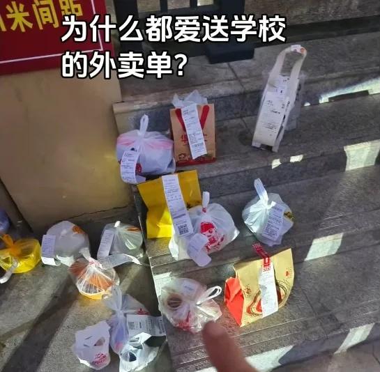 学校往往学生群体庞大、且宿舍密集,一到饭点单量瞬间爆棚,容易晒出“几十单排成一面墙”的视觉冲击画面,骑手也更容易送