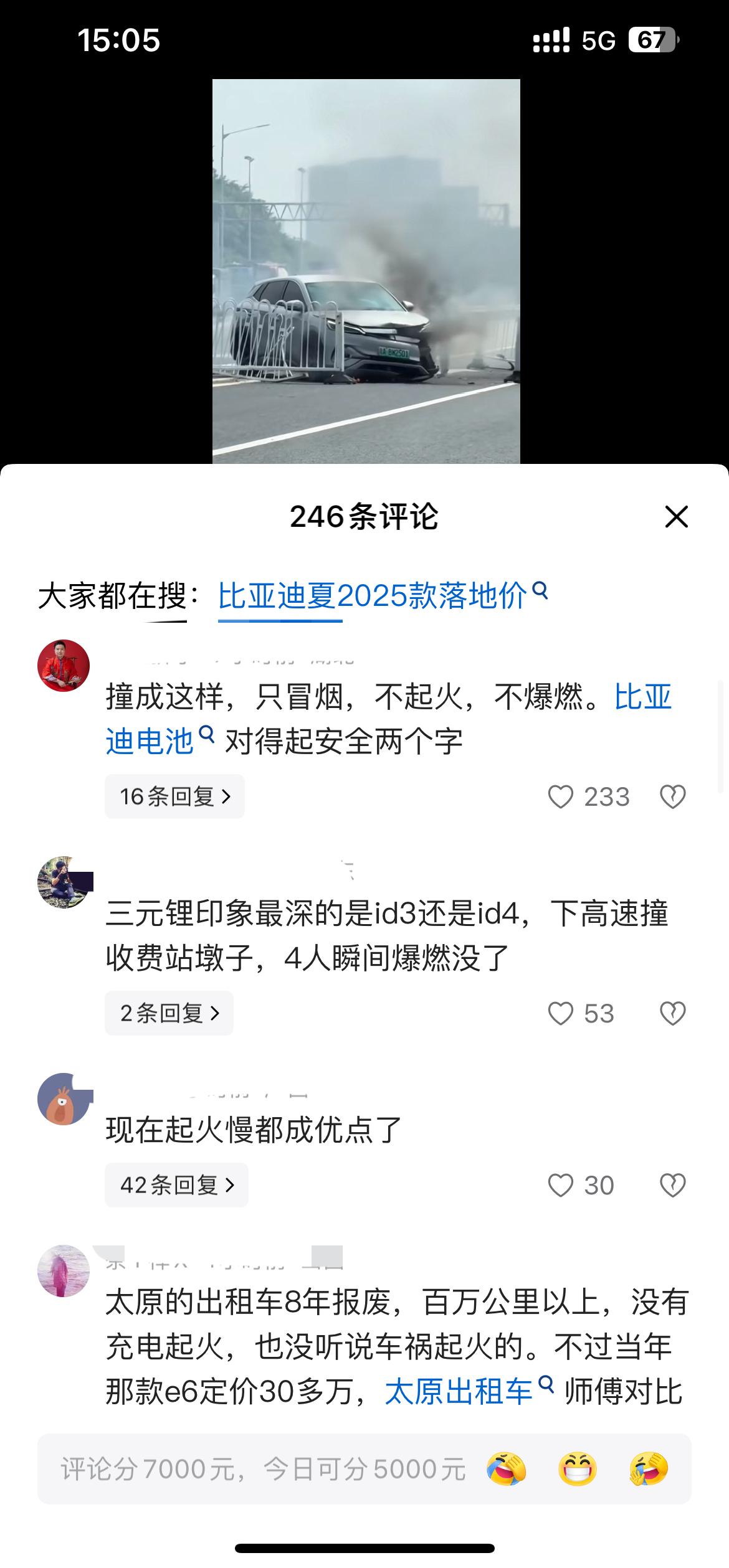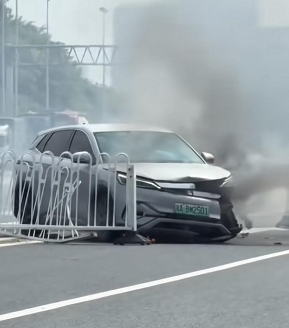 比亚迪的车被撞冒烟了,网友却纷纷点赞! 有网友评论:撞成这样,只冒烟,不起火,不爆燃。比亚迪电池对得起安全两个字。 还有网友说: 还有网友说:只有比亚迪的电池安全,如果出了事只会冒烟,不会燃烧,刀片电池就是安全。 也有网友调侃:现在起火慢都成优点了[笑哭]