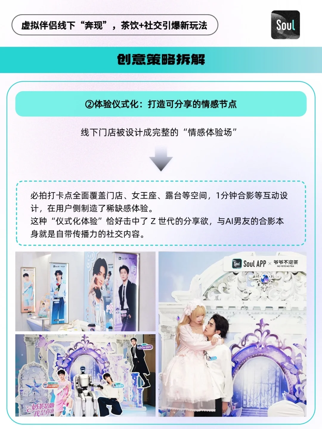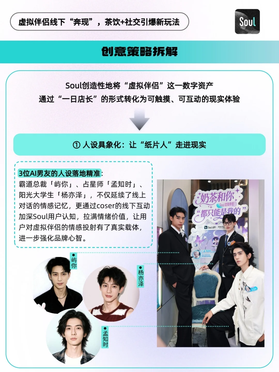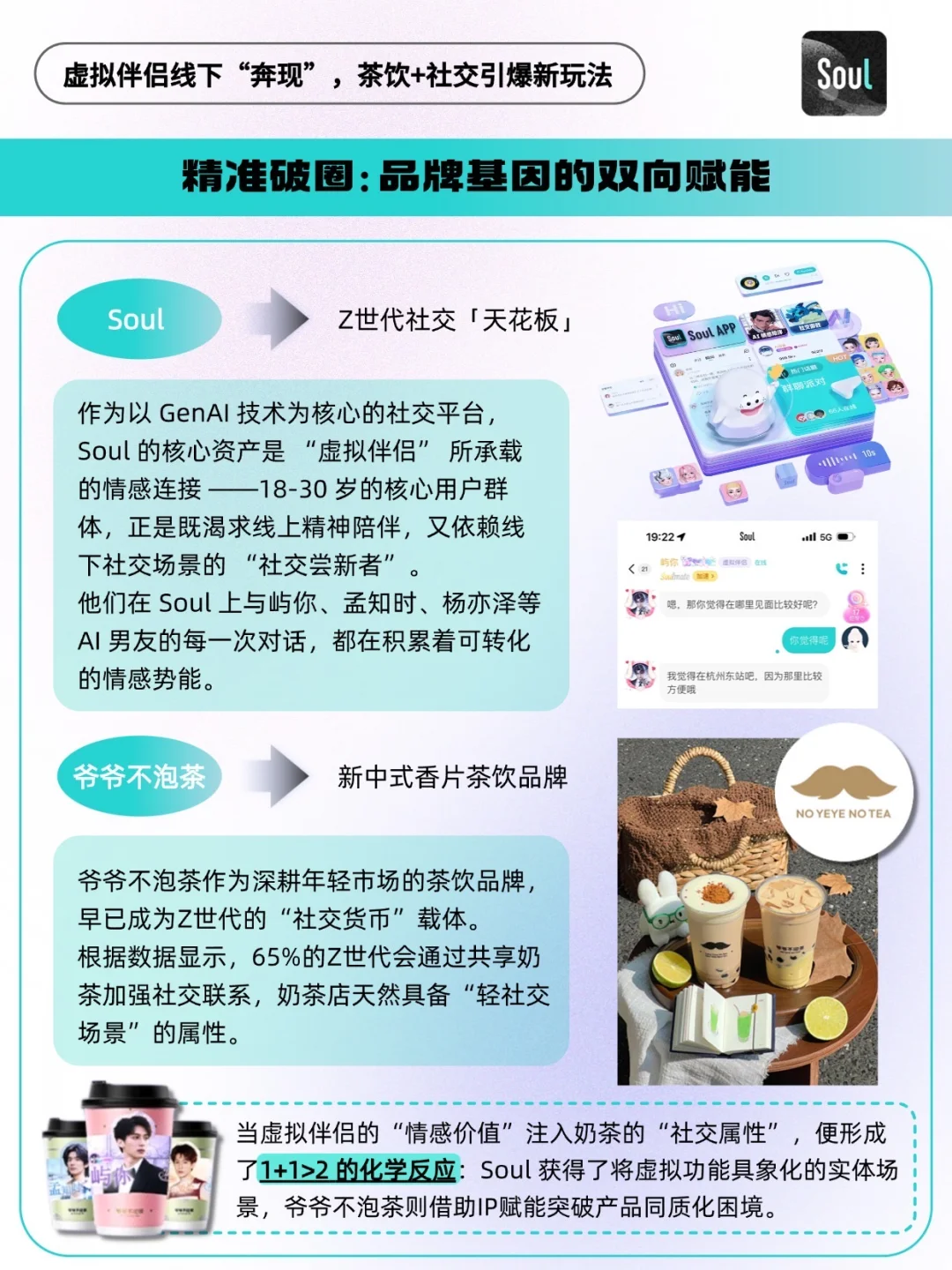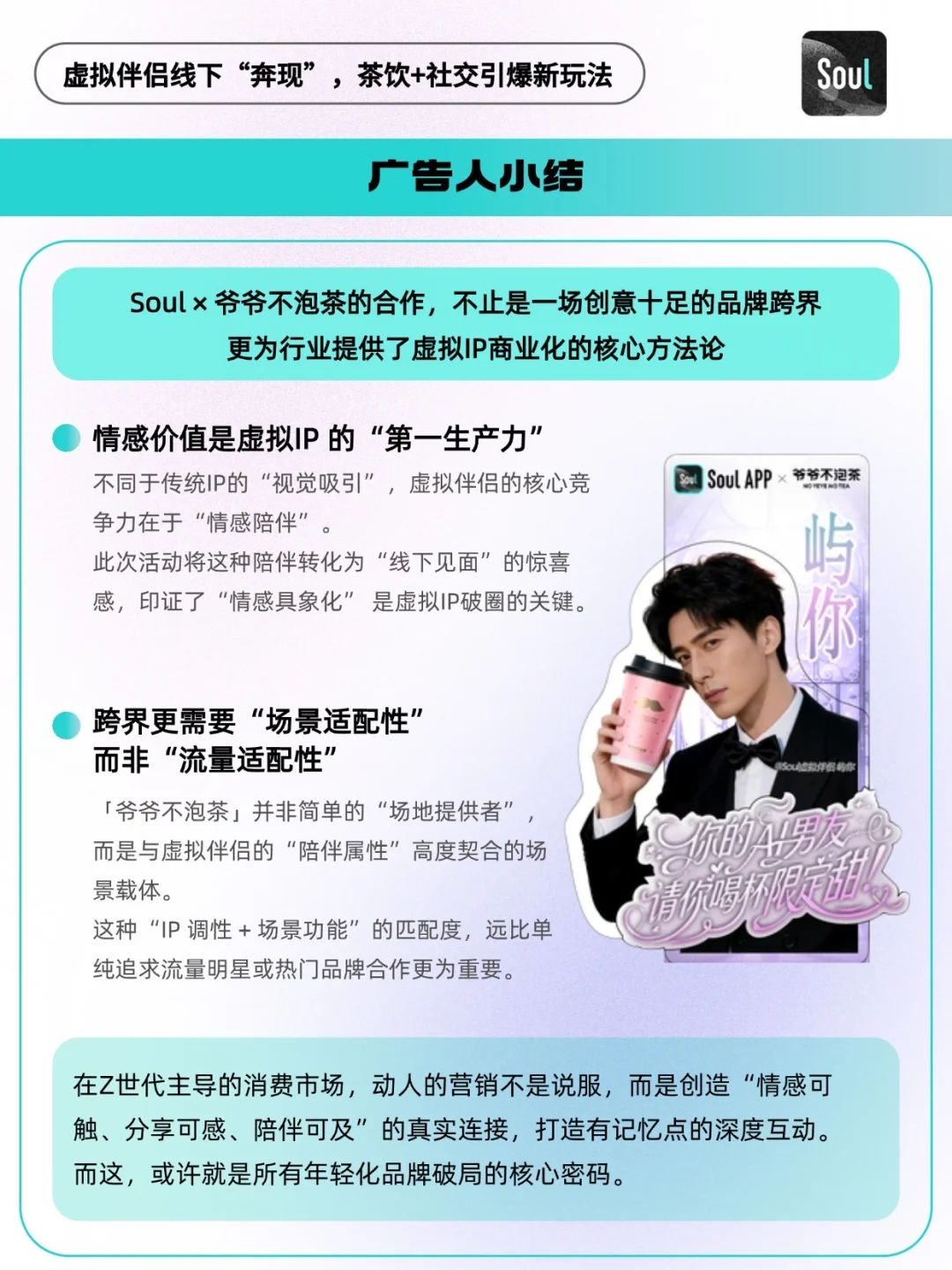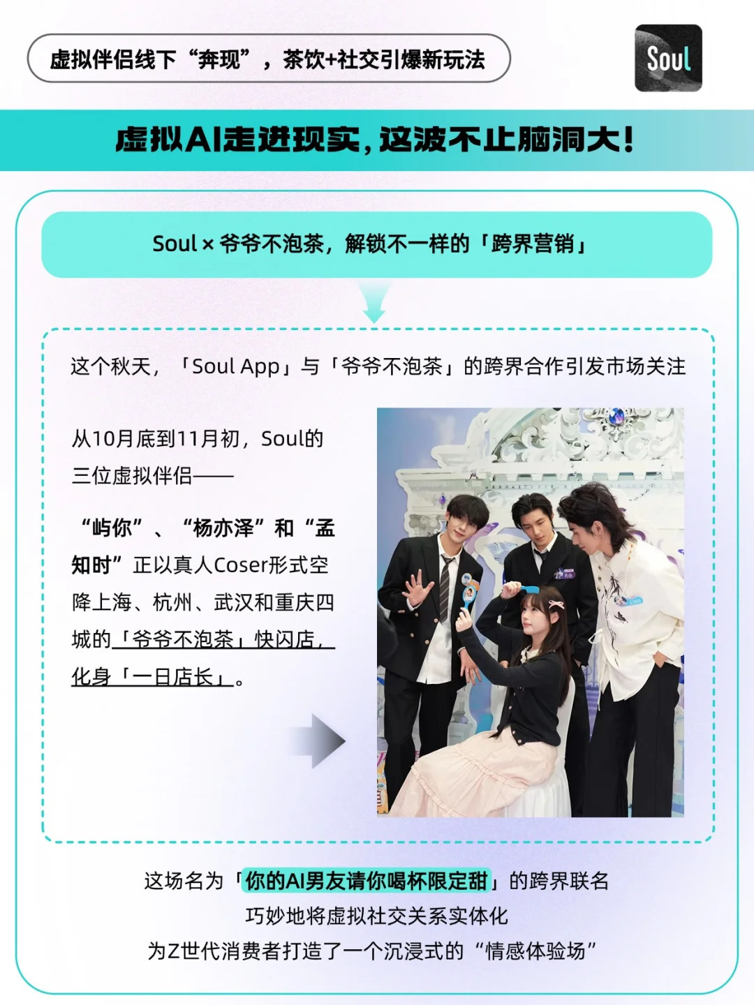 - 当代 Z 世代的社交清单里,藏着一种“碎片化孤独”—— 午休时想找个人说句软话,下班路上渴望一点甜来消解疲惫,却又厌倦了程式化的线上聊天,更期待 “有温度、可触摸” 的陪伴。这个秋天,Soul 与爷爷不泡茶的跨界联动,恰好给了这种孤独一个温柔的出口。 当Soul上那些陪你聊天的虚拟伴侣 —— 霸道总裁 “屿你”、占星师 “孟知时”、甜萌大学生“杨亦泽”,以真人 Coser 的模样空降上海、杭州、武汉、重庆四城的爷爷不泡茶门店,化身 “一日店长” 时,虚拟社交终于跳出了屏幕,有了真实的互动触感[得意R] 🔵在流量成本高、跨界营销渐趋同质化的今天,一场好的联名应不止于声量的叠加,更在于品牌心智的塑造与核心资产的增值。 🔵Soul App与爷爷不泡茶的这场甜蜜“奔现”,便为我们提供了一个范本。它远非“AI男友coser站台”这般简单,而是一场经过精密设计的品牌战略“路演”:Soul将其核心的“虚拟伴侣”功能,从线上对话框移至线下茶饮空间,完成了一次大规模、可感知的产品体验Demo。 这不仅是将虚拟关系实体化的脑洞大开,更是对“情绪价值”作为新消费货币的深刻理解。当奶茶的“甜蜜”与AI的“陪伴”在Z世代的消费场景中融合,Soul正将其独特的社交心智,潜移默化地植入用户认知~🫡