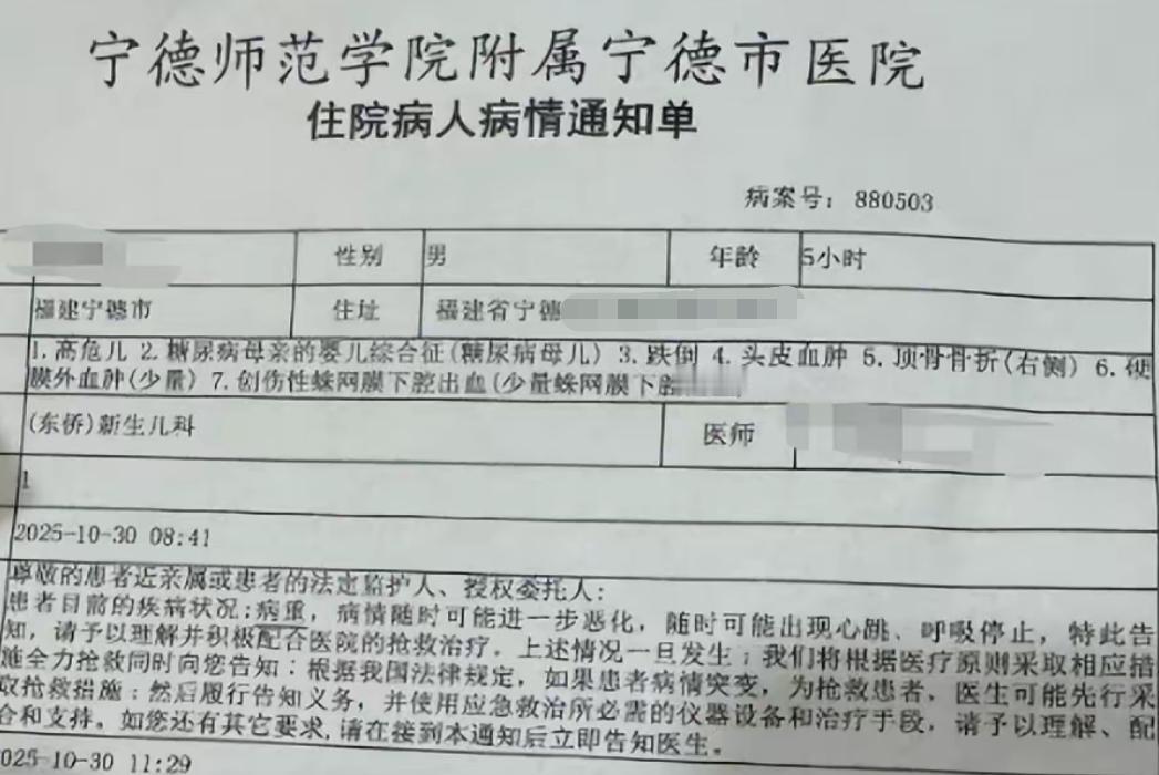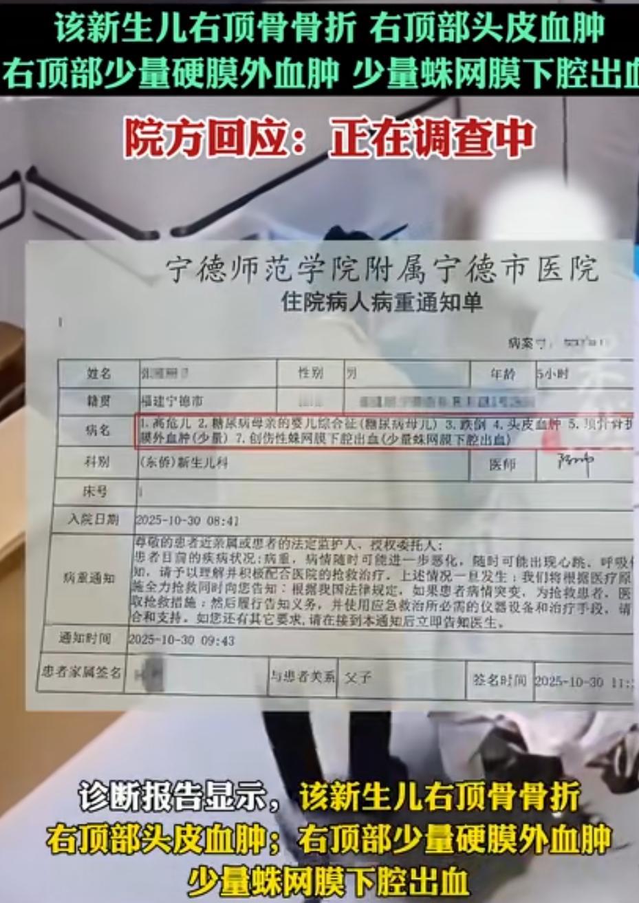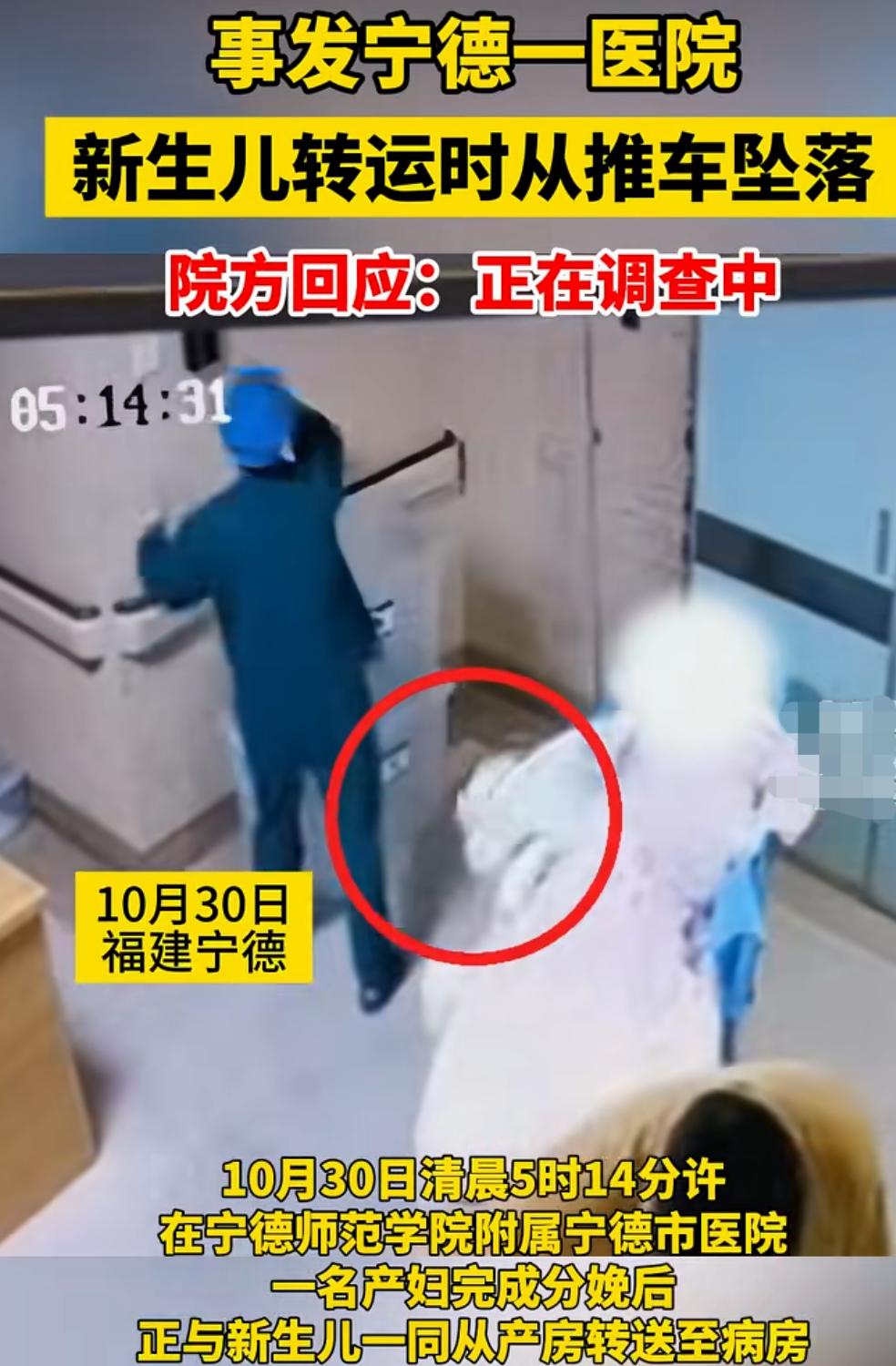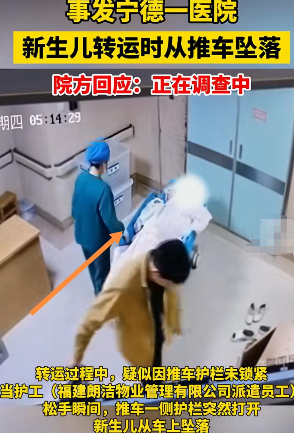 十月怀胎生产,天崩开局! 福建宁德一名出生仅2小时的新生儿,在医院转运途中,推车护栏突然落下,孩子掉下地,检查后发现右顶骨骨折、头皮血肿等严重损伤。 网传监控视频可以看到,转运推车的就一位护士,孩子是放在妈妈旁边有些拥挤,这操作太业余,正常来说,孩子应该是放在妈妈的膝盖和小腿之间,推车前面一位护士,后面一位护士。 也或者新生儿单独放一个车子里转运,很少见把孩子放侧面的,妈妈剖腹产的话,麻药还没散劲,顺产的话,劲都使差不多了,哪有精力躺那拉着孩子。 推车的护栏是质量问题还是没锁紧,这点很关键,当时那护士手离开护栏去按电梯,转身的工夫护栏直接就开了。据孩子爸爸说,事后做了检查报了警,医院方回复却让人大跌眼镜。 涉事的那位护士不是医院的人,是位护工,而且是第三方派遣工,当天人手不够就派了一个人。从监控视频中可以看出业务不太熟练,并且没有安全意识。 当前孩子生命特征稳定住了,医院为此事还在研究方案,有可能要扯皮,涉事护工是临时工,三方都会有说辞,不理解的是,为什么医院转移新生儿护士,这么重要的岗位要承包给第三方? 现在孩子检查是没事,可不能保证以后没有后遗症,这么小的孩子从车上掉下来,不亚于年幼的孩子从二楼掉下,刚来到世上就遭受这么大的罪,希望小宝宝平安无事! 娃掉地上了 娃从床上摔下来