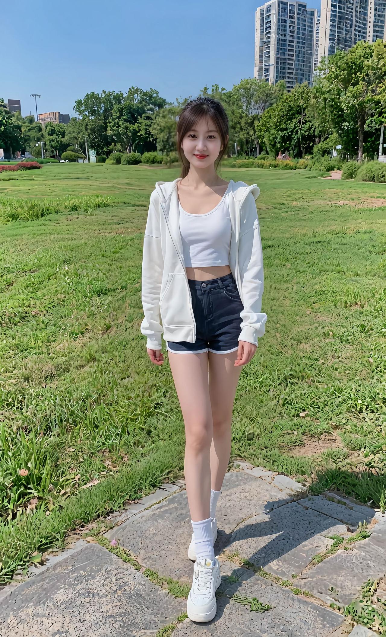 夏日清新穿搭,绿意盎然的山野间,少女漫步在青草地上,背着一个白色小包,轻松自在。