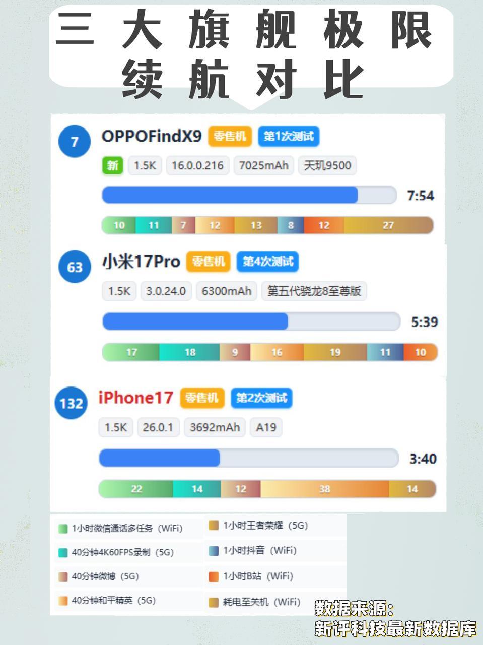 现在新出的手机,性能真的都太猛了!就单纯刷刷微博,看看抖音,机身就已经开始发热了,更别说玩原神、崩铁这种大型游戏了。 最近我就测试了市面上最热门的三款旗舰——iPhone 17、OPPO Find X9、小米17 Pro,结果在温控散热这块,三家的表现还是有点差距的! 实测在4K+60帧的条件下,连续拍摄半小时视频: iPhone 17最高43℃(表现尚可) OPPO Find X9最高仅41.5℃(散热出色) 小米17 Pro最高44.2℃(小压不住) 可以说,OPPO Find X9算是这里面表现相当不错的,散热这块算是给拿捏住了~🤌 最后再来看看它们的续航表现,根据「新评科技」的最新数据库显示: Find X9搭载的7025mAh超大电池,极限续航竟然可以高达近8小时,日常使用完全无忧; 而小米 17 Pro的6300mAh电池坚持到了5个半小时以上。只是中轻度使用还行; 至于iPhone 17,只有3692mAh的电池,最多就撑了3个多小时就不行,平时真得省着用! 这么来看,如果你是那种重度手机用户,平时还喜欢玩玩游戏,拍拍视频的话,那OPPO Find X9真心可以考虑一下了。加上现在双十一换机还有各种福利优惠,热门旗舰三选一直接冲OPPO就是了! 手机测评 旗舰手机 续航测评 视频拍摄 4K视频 大电池 OPPOFindX9 iPhone17 小米17Pro