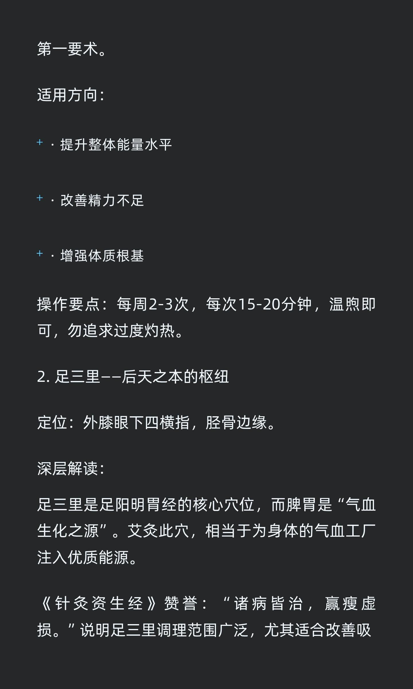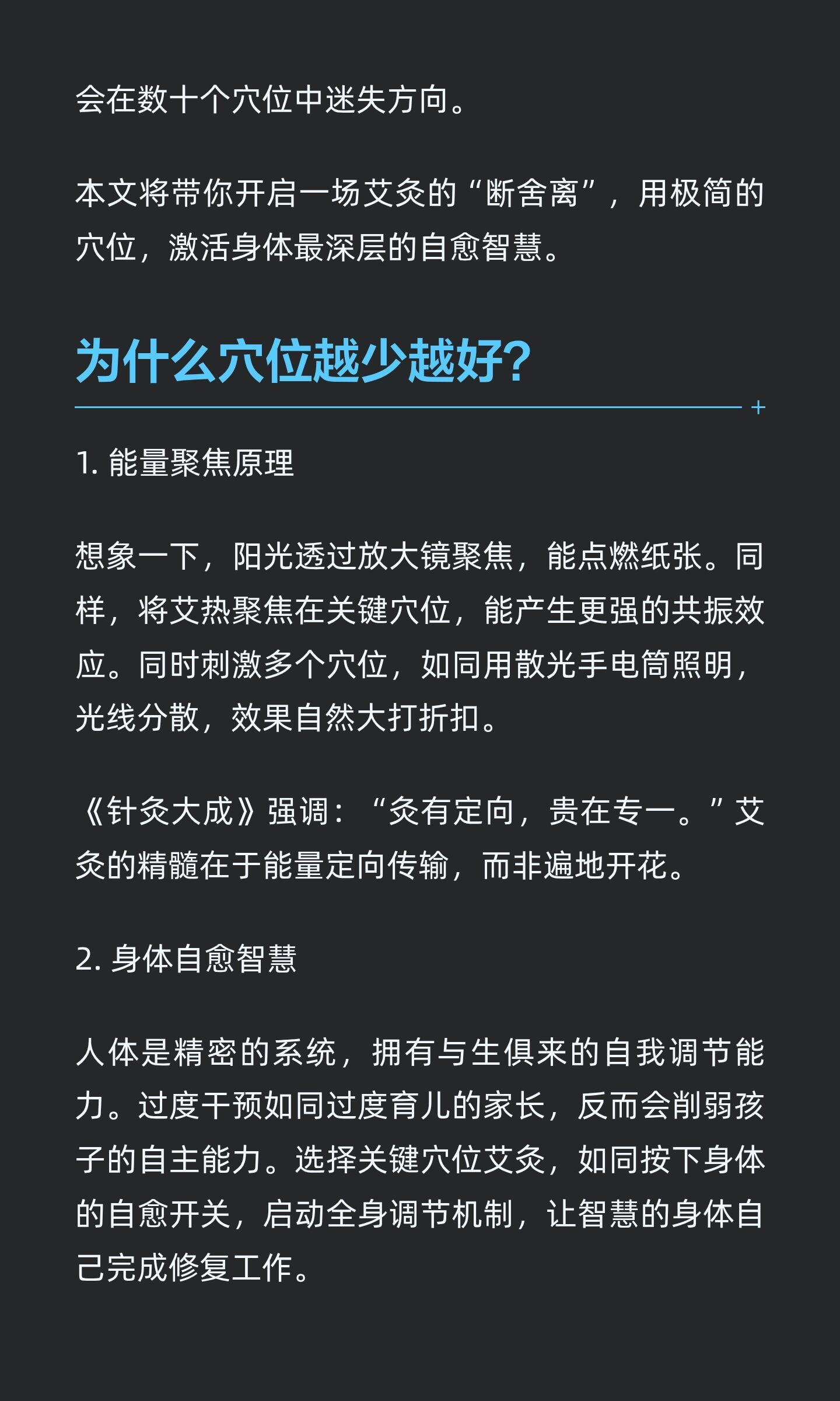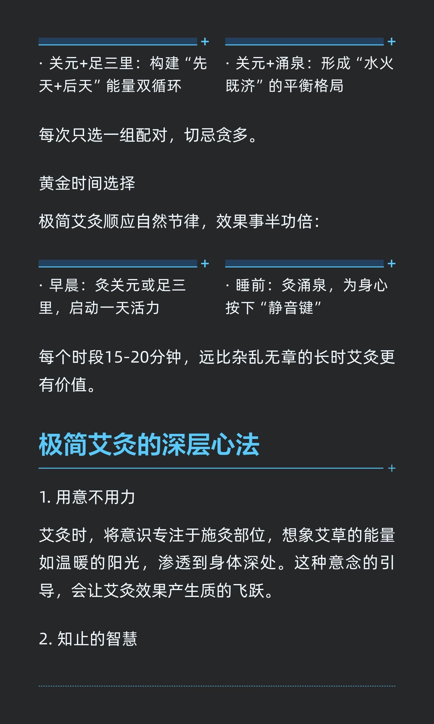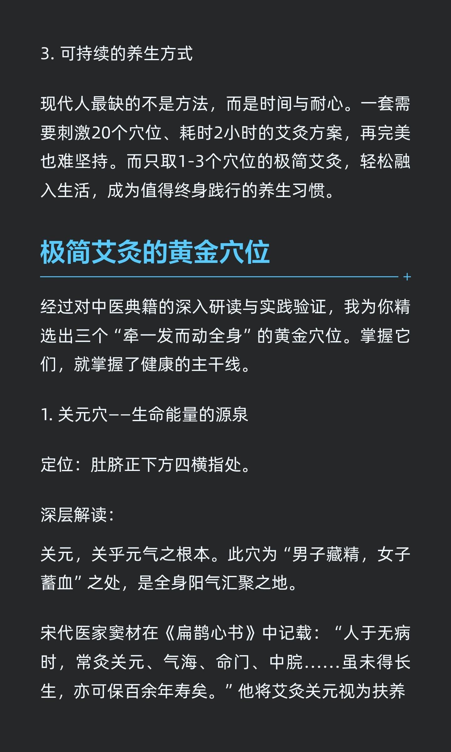 极简艾灸:用最少穴位,唤醒最强自愈力极简艾灸通过聚焦关键穴位,激活身体自愈智慧,提升整体能量水平。关元、足三里、涌泉三个黄金穴位,分别提升能量、增强消化、改善睡眠,操作简单易行,融入生活轻松养生。知艾者福善灸者寿艾灸艾条艾柱灸出好气色健康养生中医养生