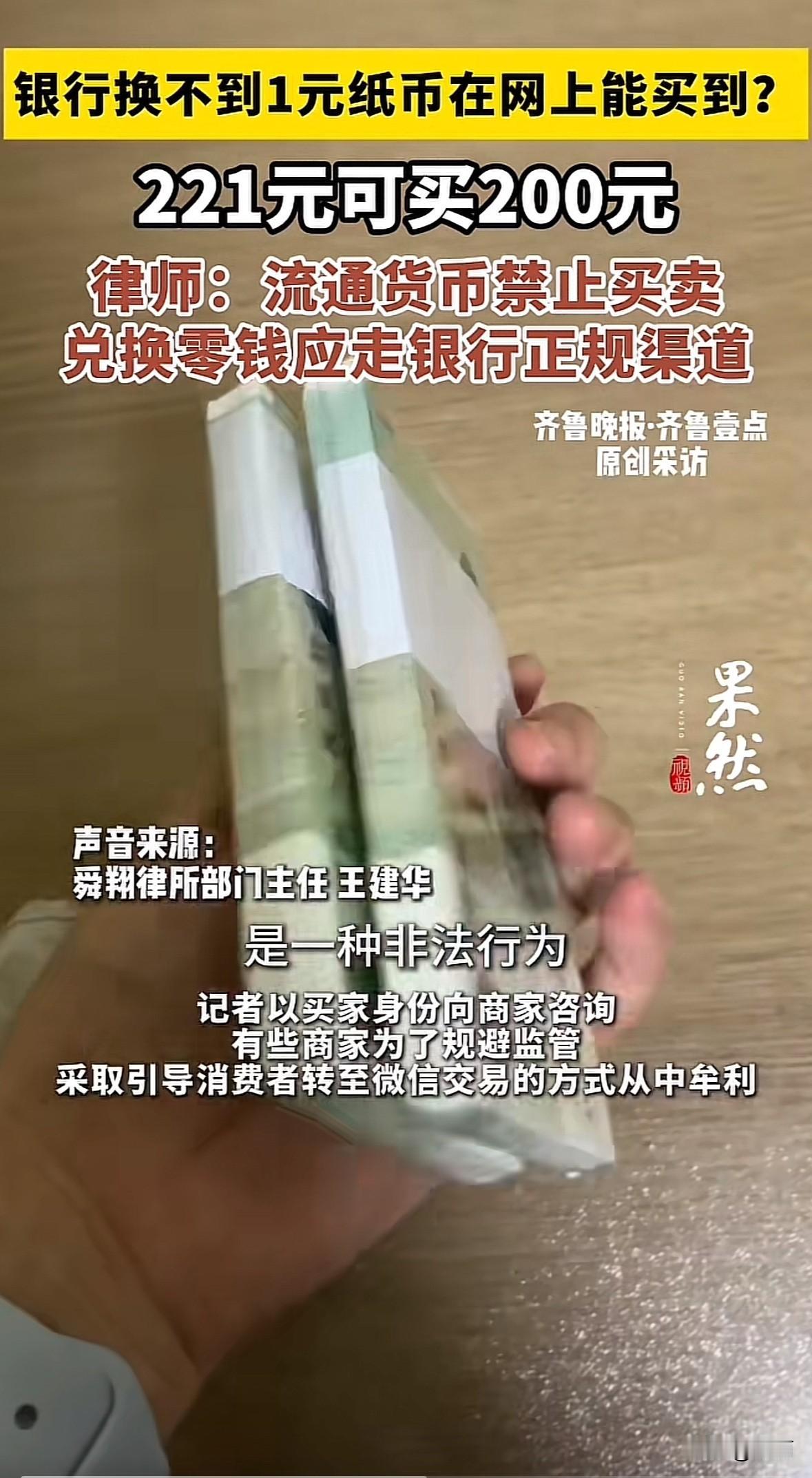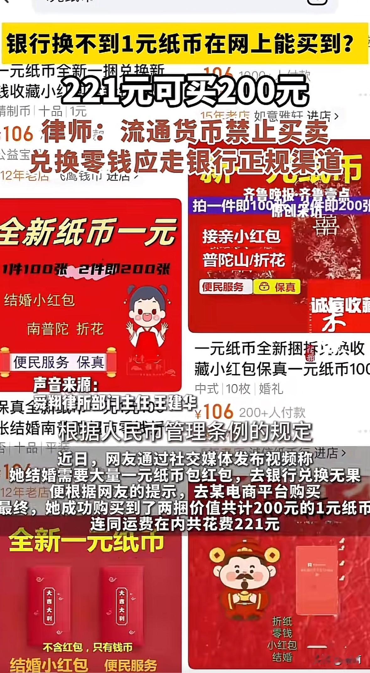 常州准新郎筹备婚礼小红包,想换全新连号1元纸币,跑遍多家银行都没换到。网上却有不少店铺售卖,他最终花220元买了200张面值1元的纸币。 银行换不到不是没纸币,是部分地区多投放硬币,纸币库存少还被商超等提前预约。网上加价卖流通人民币其实违规,有店铺因这事被处罚过。 结婚图喜庆能理解,但没必要花溢价买纸币。现在有迷你硬币红包,用硬币装红包也很方便。有需求不能碰法规红线,银行也该多考虑特殊场景需求,让大家兑换更顺畅。