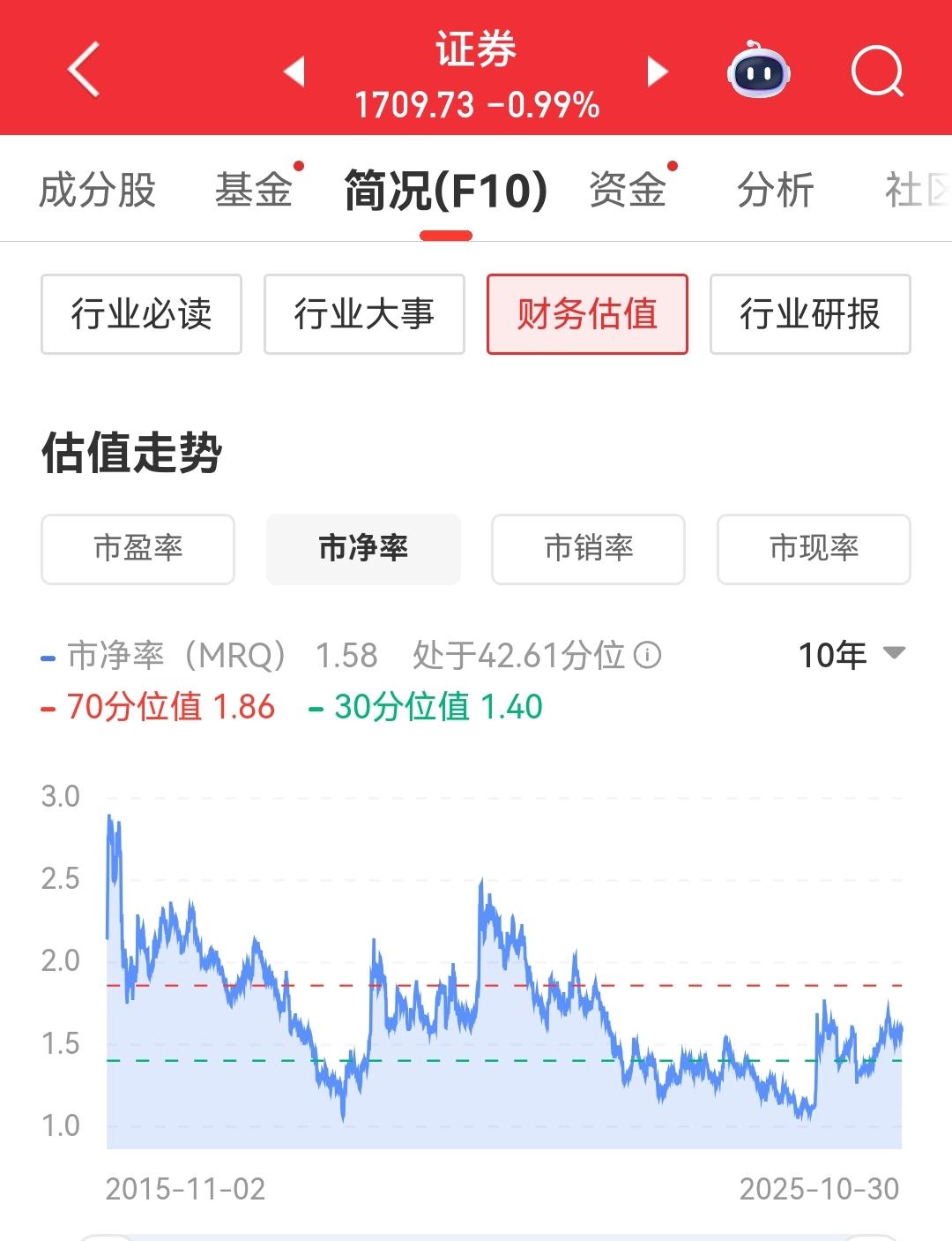 券商板块又跌了,看看它的最新估值高不高 截止10月31日收盘,券商板块的估值数据,见附下图: 1、市盈率18.17倍,处于近十年13%的分位; 2、市净率1.58,处于近十年42%的分位。 用数据说话,目前券商板块的估值很低很低了,为啥就不涨哪? 券商股
