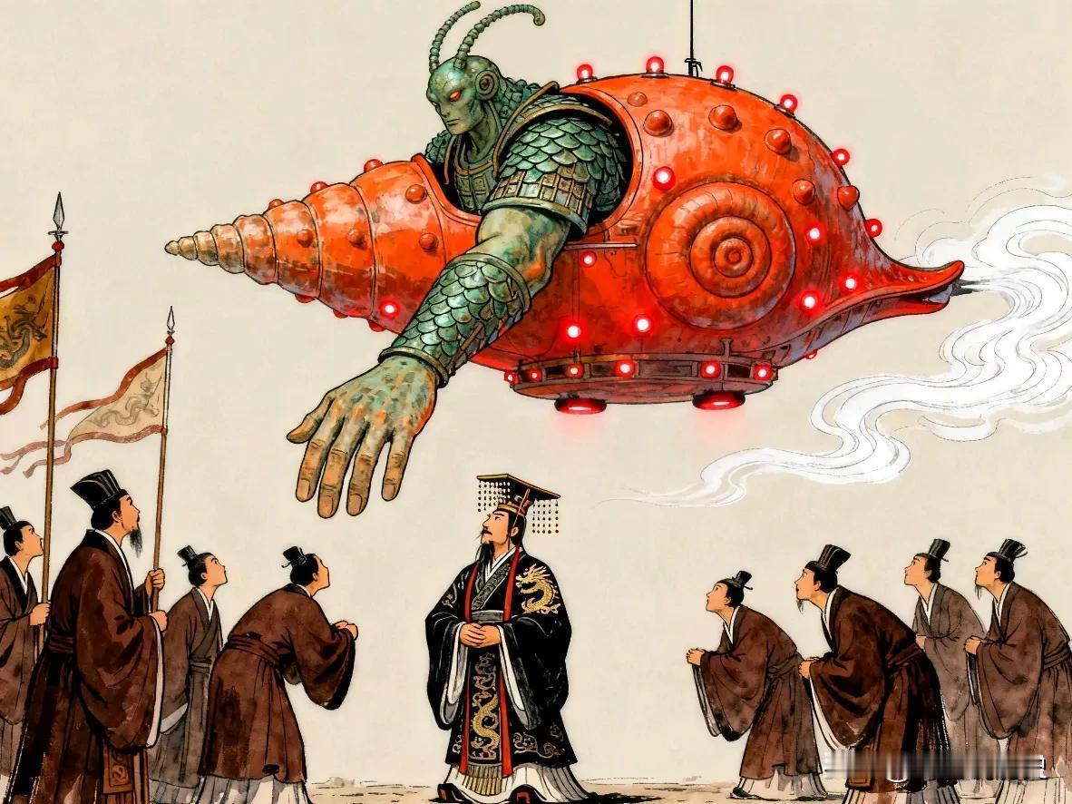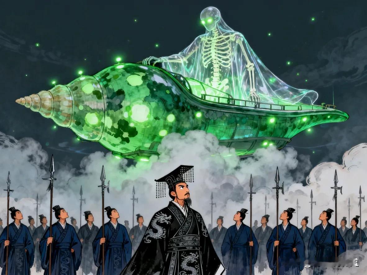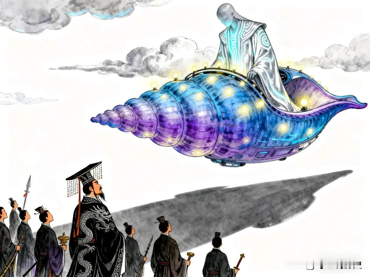 秦始皇统一中国后某天晚上,他正在宫殿里处理政务。突然,有人慌慌张张地跑来报告,说东海边冒出来个极度奇怪的东西,还发出了巨响。 没过几天,更奇怪的事情发生了。一个自称来自“宛渠国”的巨人来求见秦始皇。当这个巨人走进皇宫广场时,所有人都惊呆了——他居然有十丈(大约今33米)高,脑袋都快碰到宫殿的屋檐了! 这个巨人很懂礼貌,跟秦始皇聊起天来,对中原的历史地理都非常熟悉。秦始皇既惊讶又好奇,就问他:“你从那么远的地方来,是坐什么来的?” 巨人回答说:“我们坐的是螺舟。这种船样子像海螺,能潜在海底航行,但海水一点儿也进不去,所以也叫‘沦波舟’。” 能潜在海底还不进水的船?秦始皇心里直嘀咕,这跟他见过的所有船都完全不一样。 为了证明自己没说谎,宛渠国人拿出了几样东西给大家看。其中一个是照明用的,只有米粒那么大,可是一点亮,光芒居然能照满整个房间,比宫里所有的灯都亮。 更神奇的是,他们又拿出一个小东西,只往溪水里扔了一点点,整条溪水立刻沸腾起来,冒着的泡泡能蔓延几十里远。 秦始皇看着这一幕,心里盘算开了:要是能把这种技术用在军事上,造出不怕风浪的战船,晚上行军有神奇的光源,还能让敌人的河流瞬间沸腾……这威力简直不敢想象。 他试着问对方,能不能把这些技术教给秦国。但宛渠国人只是淡淡地说,他们的国家太遥远,这些技术是天地所赐,中原地区学不会的。他们聊到深夜才告辞,坐上那艘神奇的“螺舟”,消失在了东海里。 这件事给秦始皇留下了深刻的印象。他一方面把它当作海外奇谈记录了下来;另一方面,那个巨人的身影、米粒大小的强光光源和能让河水沸腾的力量,一直留在他心里。这来的究竟是深海国度的使者,还是……天外的访客? 从此以后,他更加积极地派人去海外寻找仙药。也许在他心里,不仅想找到长生不老的方法,更想再次找到那些神秘的宛渠国人,去获得那种超越时代的、令人敬畏的力量。而这个关于巨人和神奇“螺舟”的故事,就这样被记录在东晋王嘉的《拾遗记》里,成了一个千古谜团。秦始皇嬴政 螺舟是什么? 古文献中疑是似外星飞船事件
