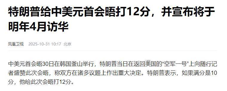 中美会晤结束后,特朗普30号在返回美国的空军一号上向随行记者盛赞此次会晤:“我可以这么说,如果按1到10来打分,10是最高分,那这次会晤我给12分。我认为那是一场非常出色的会晤。” 能让向来以强势自居的特朗普给出这么夸张的评价,显然是会谈里拿到了他最想要的结果,而最实在的变化,就是美国对华关税从57%硬生生降了10个点,落到了47%。 这可不是个小数目,要知道之前大半年里,特朗普政府把关税当成了施压的硬筹码,一会儿以芬太尼为由加征10%,一会儿又搞“对等关税”,硬生生把对华加权平均税率从三十多percent飙到了五十七,连越南都因为怕中国商品“借道”规避关税,被加征了46%的税。 现在主动降下来,说白了就是这场贸易拉锯战里,美方先扛不住了。毕竟高关税这东西从来都是双刃剑,美国消费者和企业早被折腾得够呛,麻省理工学院之前就算过账,反制关税对美国就业的伤害比加征关税的好处还大。这次除了整体关税下调,针对芬太尼问题单独加征的20%关税也砍到了10%,而且是说生效就生效,一点不含糊。 更让人意外的是特朗普嘴里的“大礼包”还不止这一个,他当场宣布要在明年4月访华,这个消息后来也得到了中方的确认,说是两国元首同意保持经常性交往,特朗普自己也盼着早点来中国。 要知道就在不久前,双方还在经贸领域剑拔弩张,美国9月底刚搞出个“50%穿透规则”,把实体清单上的中国企业从3400家扩围到可能上万家,半导体行业订单掉得跟瀑布似的,中方紧接着就抛出史上最严稀土新规反击,怎么突然就峰回路转了?其实看细节就知道,这不是突然变软,而是美方实在扛不住内外压力。 就说科技领域吧,特朗普这次特意提了要放开英伟达芯片管制,表面是示好,实则是英伟达快被憋死了。英伟达CEO黄仁勋会前特意跑到韩国见特朗普,哭诉自家先进芯片在华市场份额从95%跌到了0,要知道中国市场曾经占了他们营收的三分之一还多,这简直是直接断血。 军工和制造业的压力更直接,之前中方稀土新规一出来,洛克希德・马丁这些巨头就联名给国会写信,说库存只够撑14个月,替换供应链最快也得2027年才能投产。现在中方松口说把稀土管制措施押后最少一年,虽然军用重稀土还卡着,但民用领域的口子一开,美国企业总算能喘口气了。 而且这次会谈的细节里藏着不少门道。按往常的风格,特朗普向来喜欢端着架子,可这次居然提前站在中美国旗前等着,中方走近时主动伸手,谈完还礼让对方先行,这在以前简直难以想象。 这种姿态变化背后,是美国战略重心的悄然调整,他们2025年的《国防战略》草案里,已经把本土防御的优先级提到了大国竞争之上,说白了就是在亚洲方向有点力不从心了。更现实的是国内经济压力,美国通胀一直压不下来,前财政部长萨默斯都坦言衰退概率快到50%了,这时候再跟中国硬耗,无疑是自讨苦吃。 当然,这场会晤也不是美方单方面让步,更像是双方各退了三步。美国暂停了“50%穿透性规则”和海事、造船业的301调查,中方也相应暂停了反制措施。301调查这东西其实实质性影响不大,更多是特朗普用来争取选民的噱头,现在主动按下暂停键,说白了就是不需要再拿中国当“靶子”转移国内注意力了。 中方这边也有自己的考量,毕竟接下来要推进“8467工程”,发展新兴产业和未来产业,需要相对宽松的外部环境,现在美方松口,正好能争取到发展时间。 不过话说回来,特朗普这12分的评价里,多少也带着点政治算计。提前半年放出访华消息,既能塑造“对华接触”的形象,又能给自己后续政策留足腾挪空间,毕竟协议只签了一年,到期还得再谈。 而且他心里门儿清,中方手里的牌还没打光,前三季度对美稀土合金出口降了32%,份额早被欧盟、东盟接走了,真要是谈崩了,中方完全能“定向放量”拉拢中间派,继续给他施压。 美国财政部长贝森特会后那句“关税威胁已经结束”,更像是给这场持续半年的博弈画了个休止符,从日内瓦到吉隆坡,绕了一大圈还是得回到谈判桌前。 现在外界最关心的是,明年4月的访华能不能把这股缓和势头延续下去。毕竟这次的让步更多是应对短期压力,那些核心的结构性问题,比如科技领域的竞争、供应链安全的分歧,其实一个都没解决。 特朗普自己也说了,协议到期后还要再延续,这意味着双方的角力还远没到终点。但不管怎么说,从之前的“互相掐脖子”到现在坐下来谈妥关税、敲定访华,至少说明中美都清楚,硬碰硬没有好结果。 特朗普给会谈打12分,或许不只是因为拿到了眼前的好处,更是因为他终于看清了,跟中国打交道,得换个玩法了。