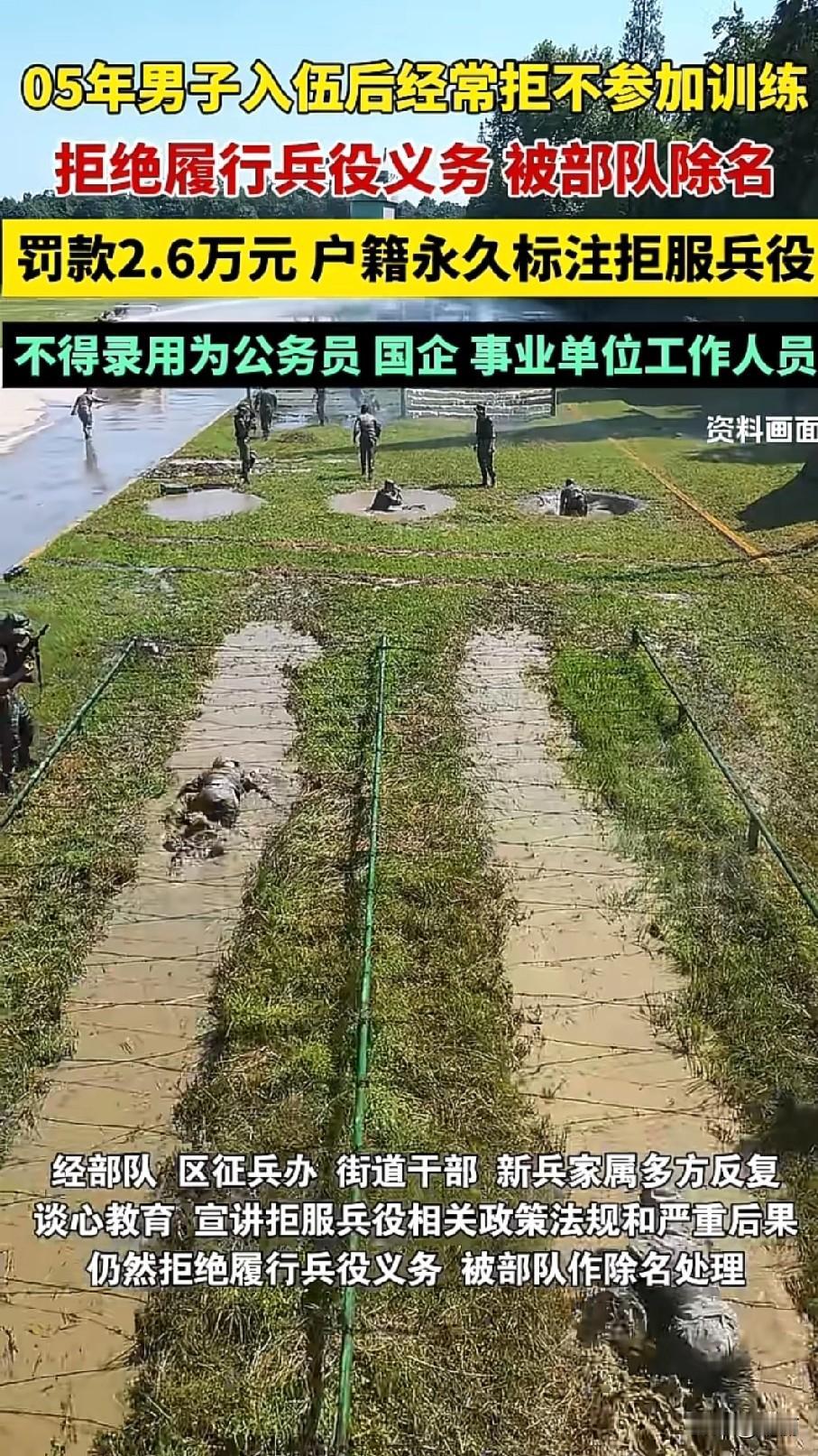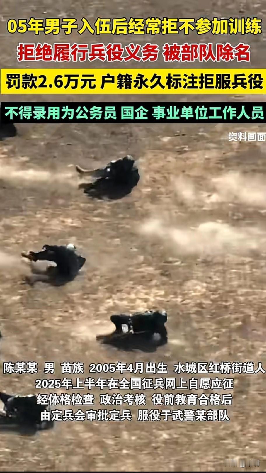 2025年有两名05后男子应征入伍后拒服兵役。贵州六盘水陈某某经常拒不参加训练,多次提离队申请,被部队除名,遭户籍标“拒服兵役”、罚款26736元等7项处罚。河北秦皇岛马某某也因不适应训练管理拒履行义务,被除名后罚款86400元,同样面临多项限制。 服兵役是公民法定义务,不是可随意反悔的选择。部队严格管理和训练是为了保家卫国,不能因吃不了苦就逃避。这些处罚不是小题大做,是维护法律尊严。年轻一代得有责任担当,不能缺乏抗压能力。希望这些案例能警示更多人,敬畏法律,明白参军光荣、拒服可耻的道理。
