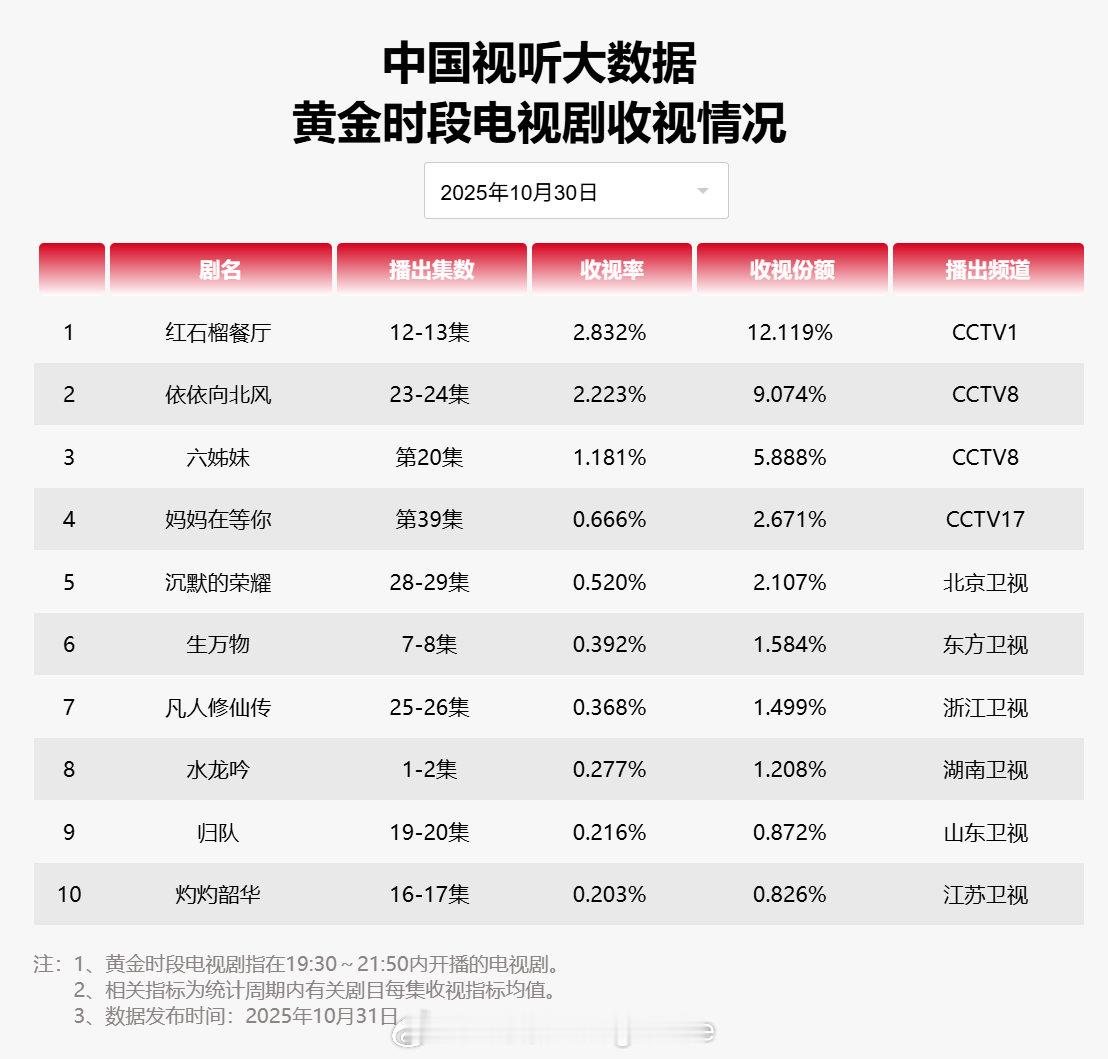 【2025年10月30日中国视听大数据CVB黄金档电视剧收视率日榜TOP10】