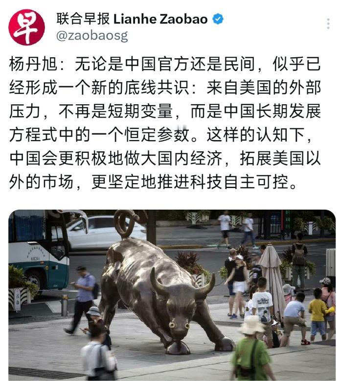 新加坡联合早报10月29日晚,发表杨丹旭的评论:“无论是中国官方还是民间,似乎已经形成一个新的底线共识:来自美国的外部压力,不再是短期变量,而是中国长期发展方程式中的一个恒定参数。这样的认知下,中国会更积极地做大国内经济,拓展美国以外的市场,更坚定地推进科技自主可控。” 新加坡联合早报那位杨丹旭说得挺实在,现在不管是中国官方还是普通老百姓,心里都门儿清——美国带来的外部压力这东西,不是一阵风就过去的,得当成长期要面对的事儿。这种共识不是凭空冒出来的,全是这些年一次次实打实的博弈逼出来的清醒。 就说2024年那事儿,美国众议院以306票对81票通过了个《生物安全法案》,指名道姓要限制华大基因、药明康德这些中国生物技术公司。理由说得冠冕堂皇,说是要“保护美国基因数据和国家安全”,实际上就是摆明了要在高科技领域堵中国企业的路。 这法案一出来,药明系的股价当天就跌了16%还多,连带整个CXO板块都跟着遭殃。可你看中国企业的反应,没慌神,药明康德直接站出来说法案里的指控“既不恰当也不准确”,自己从没危害过任何国家的安全。华大智造也赶紧澄清,指出法案里多处事实错误。 中国外交部更不含糊,发言人毛宁直接表态,坚决反对这种歧视性措施,要求美国停止滥用借口打压中国企业。 这事儿看得很明白,美国的限制不是临时起意,从2023年把华大基因子公司列入贸易黑名单,到2024年搞出这么个针对性法案,路子越来越明确。这种持续加码的压力,让大家彻底断了“短期缓和”的念想。 外部路被堵了,内部就得把市场做大。这几年中国一门心思搞国内大循环不是没原因的。有数据撑着,2021到2024年,内需对经济增长的平均贡献率都到86.8%了,光最终消费支出就贡献了近60%,比“十三五”那会儿提高了11个百分点。 老百姓的消费力在那儿摆着,城镇化率都到67%了,城乡收入差距也在缩小,从2020年的2.56倍降到2024年的2.34倍。中西部地区更是发力明显,生产总值占全国的比重都升到42.9%了。这么大的国内盘,就算外面有风浪,自家的基本盘也稳得住。 光靠国内还不够,得找新的外贸伙伴。美国市场占比降下来的同时,其他地方的合作接上了。著名经济学家李大霄分析过广交会的数据,2024年那届来了20多万境外采购商,其中“一带一路”沿线国家占了72%,金砖国家也有27.4%,中东国家占14.3%。 中国对美出口的占比早就下来了,2018年还占19.2%,到2024年已经跌到14.7%。货物贸易总额倒是从2020年的32.2万亿元涨到2024年的43.8万亿元,年均增长8%。 服务贸易更厉害,2024年首次突破1万亿美元,“中国游”“中国购”越来越火。这就是把鸡蛋分到不同篮子里,美国那边施压越狠,其他市场的开拓就越积极。 科技自主这块儿更是被倒逼得加速了。美国越是卡脖子,中国越明白核心技术买不来。2021到2024年,高技术产业投资年均增长13.5%,比整体投资增速快多了。 就拿被美国盯紧的生物技术来说,即便法案施压,中国企业该研发还是研发,该拓展业务照样拓展。这种劲头不光在生物领域,芯片、新能源这些被限制的领域都一样,把外部压力变成了研发的动力。 中美之间的打打谈谈也印证了这种长期博弈的态势。2025年10月,美国刚对华船舶加收港口服务费,中国立马对等反制,征收特别港务费。美国想收紧稀土出口,中国直接出台更严的稀土物项出口管制。 紧接着两国又在吉隆坡坐下来磋商,最后美方取消了原定的关税举措,还同意延长关税休战协议。这种“边打边谈”的模式反复上演,让大家看清了:没有一劳永逸的解决方案,只能在博弈中寻找平衡。 “生于忧患,死于安乐”这话真没说错。要是没有美国这持续的外部压力,国内市场的潜力说不定还不会被这么快激活,非美市场的布局也不会这么果断,科技自主的决心更不会这么坚定。 现在这种共识已经扎根了,不管美国接下来出什么招,中国的路子很清晰:把自己的经济盘做扎实,把朋友的圈子扩大,把核心技术握在手里。 这种状态不是被动应付,而是主动调整。美国把压力变成长期参数,中国就把应对变成发展策略。从企业到国家,从市场到科技,都在这种忧患意识里找机会、求突破。这大概就是杨丹旭想说的,这种共识已经成了底线,也成了接下来往前走的底气。