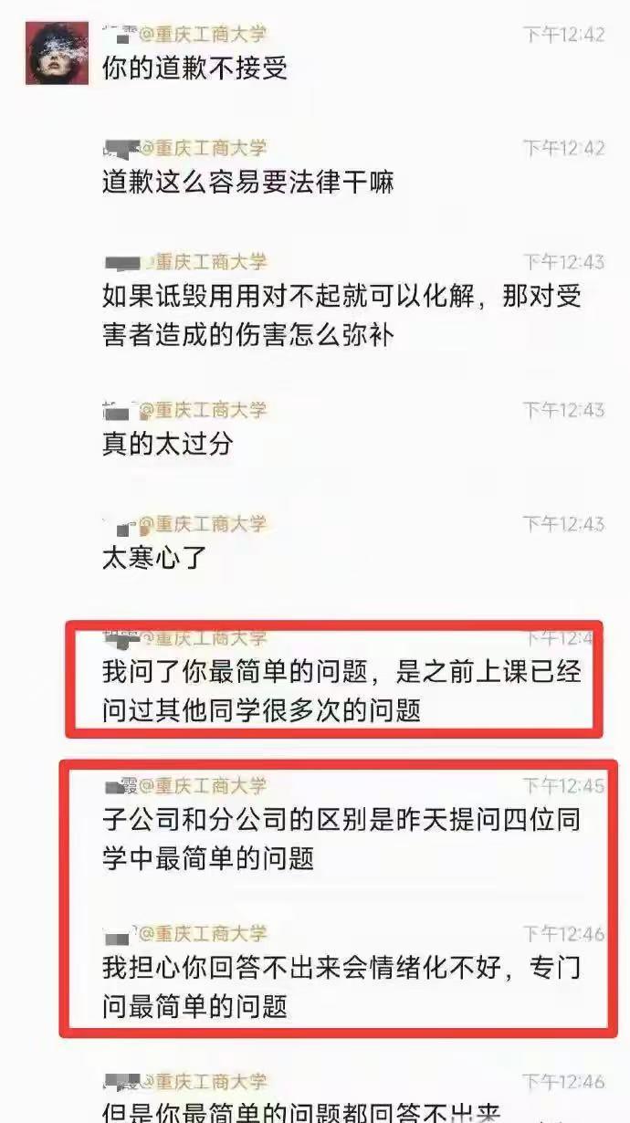 休想泼脏水!一个还是法学院的学生竟然在个人账号上公开污蔑老师,说她媚男。老师起诉她也并非不近人情,:个体的名誉与尊严不容侵犯,是非对错的边界不容模糊。 张口闭口就说“老子”哪里像一个大学生该有的样子,她的这次道歉估计也不好使了。 谣言张张嘴,真相跑断腿。大多网友支持老师维权。 想想一个法学院的学生这么污蔑老师,等她毕业了,如果她从事法律工作,能够公平公正的对待案 子吗? 起诉说明法治在进步,不以势压人,而是以平等的身份寻求法律正义。大学生是成年人,有完全民事能力了。 支持这个老师以身入局,给大家上了一堂生动的法学课,言论自由也是有限度的,网络不是法外之地。