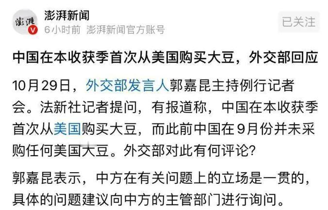 美国财长贝森特昨晚(北京时间10月30日)表示,特朗普已与中国达成协议,中国将每年购买2500万吨美国大豆,其中1200万吨立即交付。   这消息一传出来,美国中西部那些种豆子的农民,估计都得连夜开香槟庆祝。但懂行的都清楚,这可不是中国给谁面子,纯粹是咱们照着自己的需求,算得一笔门儿清的账。   先把实打实的数据摆出来,咱们国家每年要进口的大豆,差不多稳定在1.1亿吨上下,这数可不小。你想想,家里炒菜用的豆油、炖肉吃的猪肉、超市买的鸡蛋,全跟大豆有关系,豆油是直接能吃的,榨完油剩下的豆粕,更是养猪养鸡养鸭的核心饲料。   这么大的需求,单靠国内种的根本不够,从国外买是肯定的。过去这些年,美国大豆在咱们的进口里,大概占两成份额,算下来一年差不多买2200万吨,这次2500万吨的协议,比往常还多了点儿。   但这绝不是说中国把所有希望都放美国这一棵树上了。要知道美国大豆在咱们这儿的份额,从来就没稳过。前些年因为关税的事儿折腾,它在咱们这儿的占比,从2016年的40%硬生生掉到了2024年的20%,空出来的份额全让巴西、阿根廷这些南美国家给填上了。   就说2024年,咱们单从巴西就买了7465万吨大豆,占了进口总量的七成多。这就是中国市场的底气:进货渠道多的是,谁有诚意、豆子质量好、价钱公道,咱们就跟谁合作。   美国这次能拿到比往常还多的订单,说白了就是总算把态度摆正了。就在几个月前,美国豆农还为没订单愁得慌,伊利诺伊州的农民看着堆成山的大豆,急得团团转。美国大豆协会更是急着发警告,就怕到了秋天,豆子全砸自己手里卖不出去。   毕竟中国是美国农产品最大的买家,占了他们农产品总出口的快五分之一。2024年美国大豆出口总共卖了245亿美元,光卖给中国就占了128亿美元,一半的豆子都得靠咱们消化。要是丢了中国市场,美国农民根本扛不住。   这笔买卖对两边来说,都是真真切切的好处。对美国农民来讲,这2500万吨的订单就是定心丸,意味着收入稳了。2023年的数据显示,平均每个美国农民,单靠给中国出口就能挣近9000美元,这次的大单更是给他们吃了颗强心剂。   对咱们来说,1200万吨马上交付的大豆,能赶紧补上国内的库存,饲料价格稳了,咱们菜篮子里的东西也就更便宜、更稳定。而且这也不是一锤子买卖,中美在农业上的合作本来就是两国关系的老根基,不管是精准种地的技术,还是节水灌溉的方法,往后能合作的地方还多着呢。   有人可能会问,那咱们为啥不干脆全从南美买?这里面藏着个季节差的门道,美国大豆的收获时间和南美正好岔开,咱们两边都买,就不用担心因为某个地方的收获季节出问题,导致大豆供不上。   更关键的是,保持这么多进货渠道,咱们在谈判的时候腰杆才硬,不会被哪一个国家掐住脖子。这次美国愿意拿出诚意,咱们就适当多买点儿,这就是市场规律说了算,跟谁施压没关系。   说到底,咱们中国买东西,从来不是看谁喊得凶,而是看谁真有诚意、办事实在。过去美国大豆份额掉下来,问题全在他们自己身上;现在能把订单拿回去,是因为他们总算认清了中国市场有多重要。   这2500万吨的订单,既是对美国诚意的回应,更重要的是中国保障自己供应链稳定的主动选择。毕竟对咱们来说,老百姓的餐桌稳当、养殖业的成本平稳,比啥都重要,这才是最实在的民生大事。