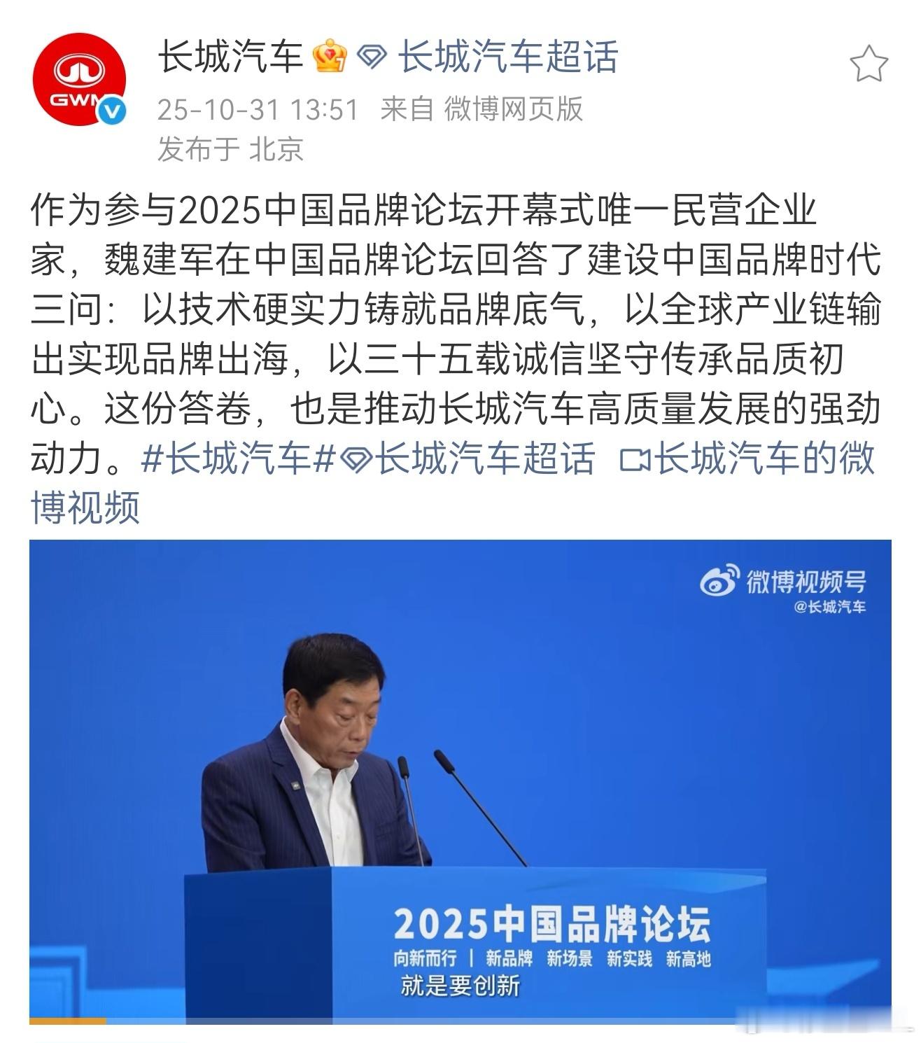 10月29日,由人民日报主办的《2025中国品牌论坛》在雄安新区举行。长城汽车魏