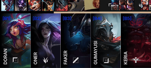 T1选用:Doran奥恩;Oner梦魇;Faker维克托;Gumayusi卡莎;Keria妮蔻
