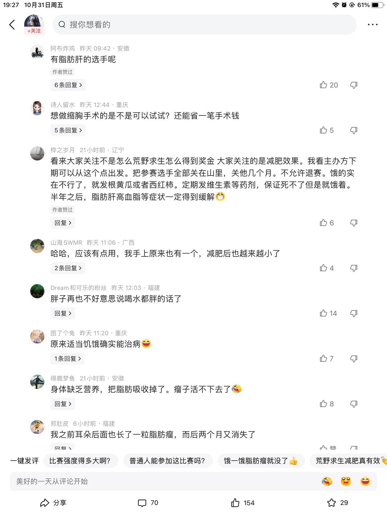 减肥新发现!减肥新发现! 荒野求生七星杯,能耐大的选手是去度假,顺带着拿奖金。学中医的林北是去学以致用,拉拉流量,给大众点看头儿。20号选手杨亦宸,来自湖南靖州,去的时候胳膊上有个大的脂肪瘤,参赛二十天,脂肪瘤被吸收了,选手自己都惊讶不已。 这个我也有发言权,我的后背也有一个脂肪瘤,我曾经去医院咨询,割掉需要两千多块钱。还要缝针。不过医生也建议,可以不动它。不太会长大,也不咋会缩小。不动也不是个坏事。动,就会留下疤痕。 我又抠又怕疼,就放弃了。 今年夏天,我减肥了十来斤,因为孩子高考前后,我也是比较操心,自然而然的就瘦了。以前我侧躺的时候,能压到它,现在竟然感觉不到了。用手一摸,还有,小了很多。笑死,减肥竟然还能调理身体。 书归正传,减肥有个屁的方法,纯靠饿。基数大的,以后都报名荒野求生吧!饿瘦还有奖金拿!