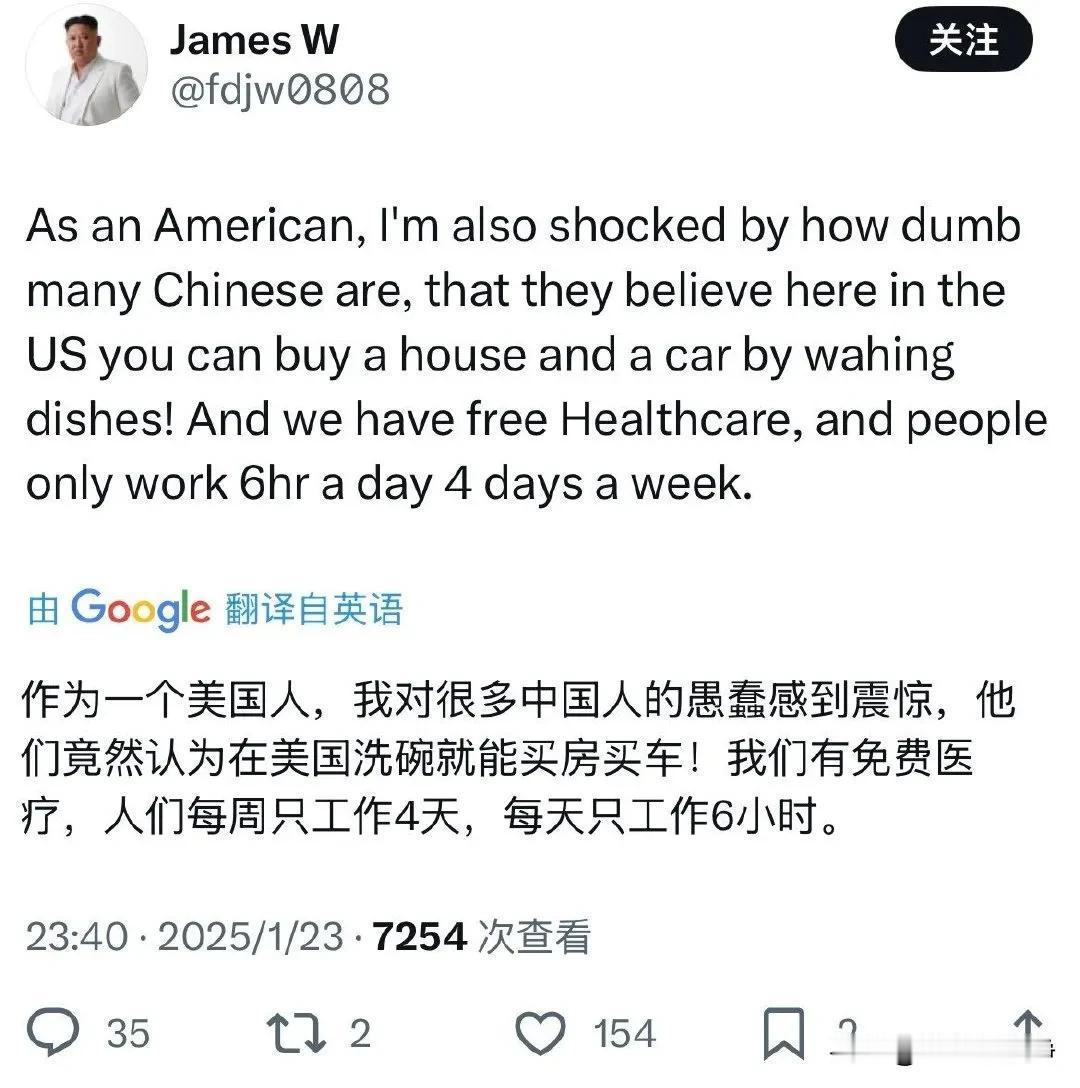 看来美国人也会上中国的网络了。他们听到了一些大殖子们的离奇言论之后,全都傻眼了。 因为润过去的很多中国人因为语言和文化的问题都不会在西方网络上交流。 所以很多混的不好的润人还是会在国内的互联网上发表一些言论。 他们为了掩饰自己的失败或者说能骗一个算一个。 他们不断的宣传美国有多么多么美好。 全都是谎言编织的。 最早美国人也不知道这些人在说些什么,但是后来慢慢地中国的网络也开始和国际衔接了。 很多国内网络平台上的言论就被搬运到了欧美的网络上。 这下轮到美国人破防了。 大家看看这些美国的网友是怎么评论的? 作为一个美国人,我对很多中国人的愚蠢感到震惊。 他们竟然认为在美国洗碗就能买房子买车。 他们居然认为我们有免费的医疗。 他们居然认为人们每周只工作4天,每天只工作6小时。 看看美国人自己都破防了。 这帮人真的是太能编了。 润出去之后自己日子过得不好就回头骗国内的网友。 关键是国内还有一群人真信。 真的是无语了!