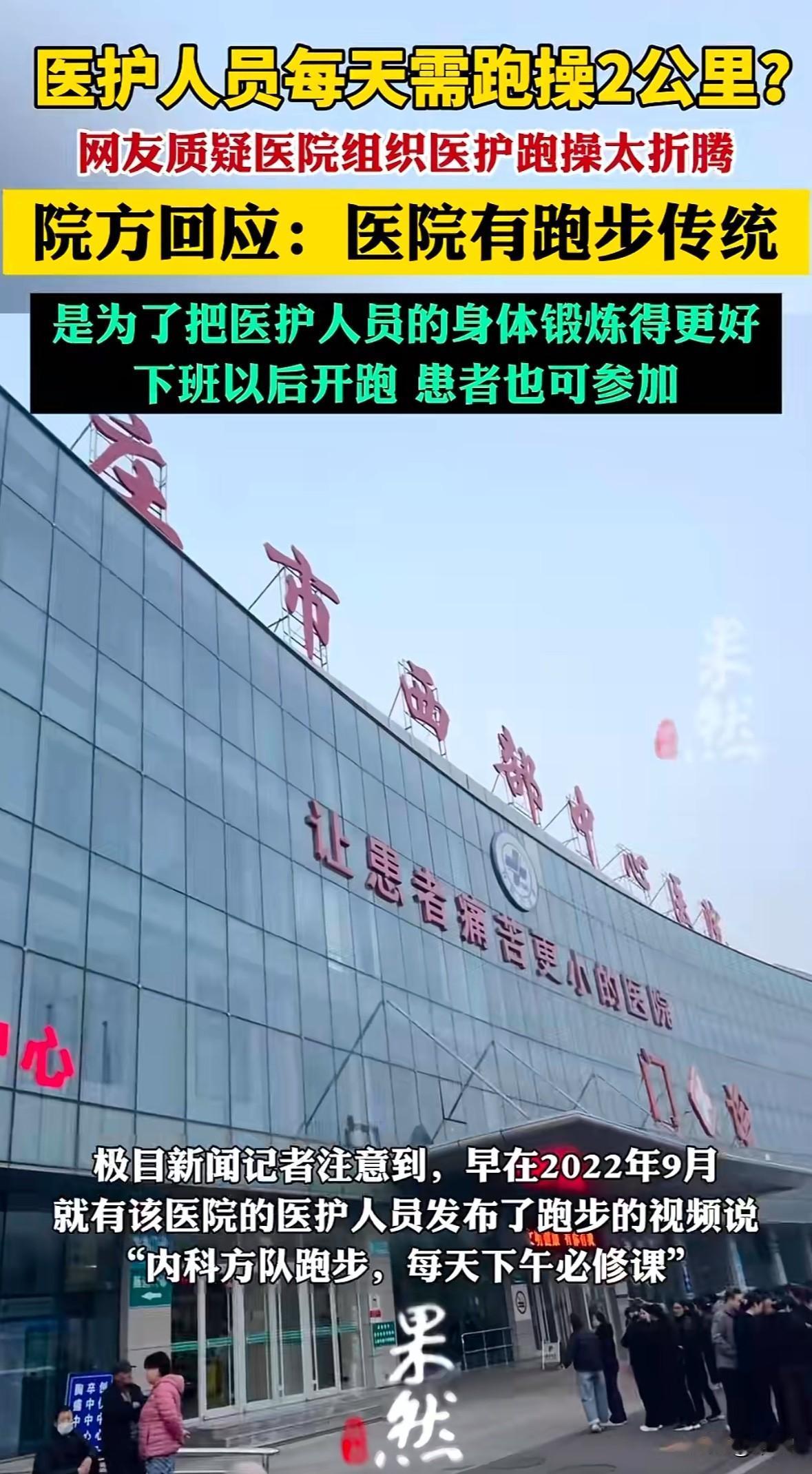 河北石家庄西部中心医院,医护人员下班后要集体跑操。每周一到周五下午五点半,跑五圈约两公里,跑前点名唱红歌,不值班不手术的都得参加,跑不了要开假条,还有走步方队。 院方说初衷是让大家锻炼身体,更好照顾病人,还能让患者一起参加,现在交接班晕倒的情况没了。 有人觉得这是关心医护健康,能增进医患互动。也有人吐槽,医护工作本来就累,下班该休息,强制跑操占用时间,忽视个体差异。 其实关爱医护是好事,关键得人性化。别搞“一刀切”,多考虑大家的实际情况,让锻炼变成自愿又舒心的事,才真的有意义。