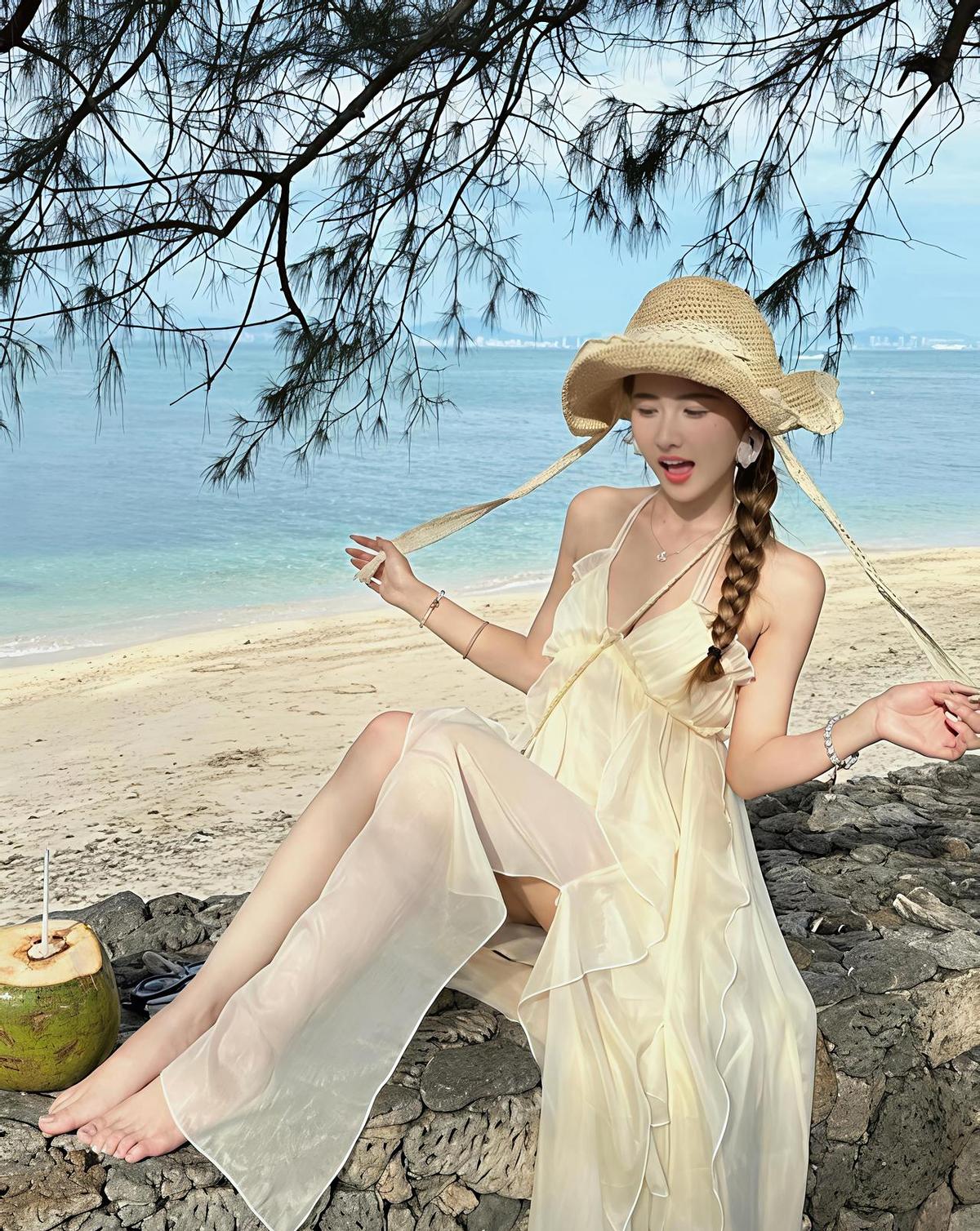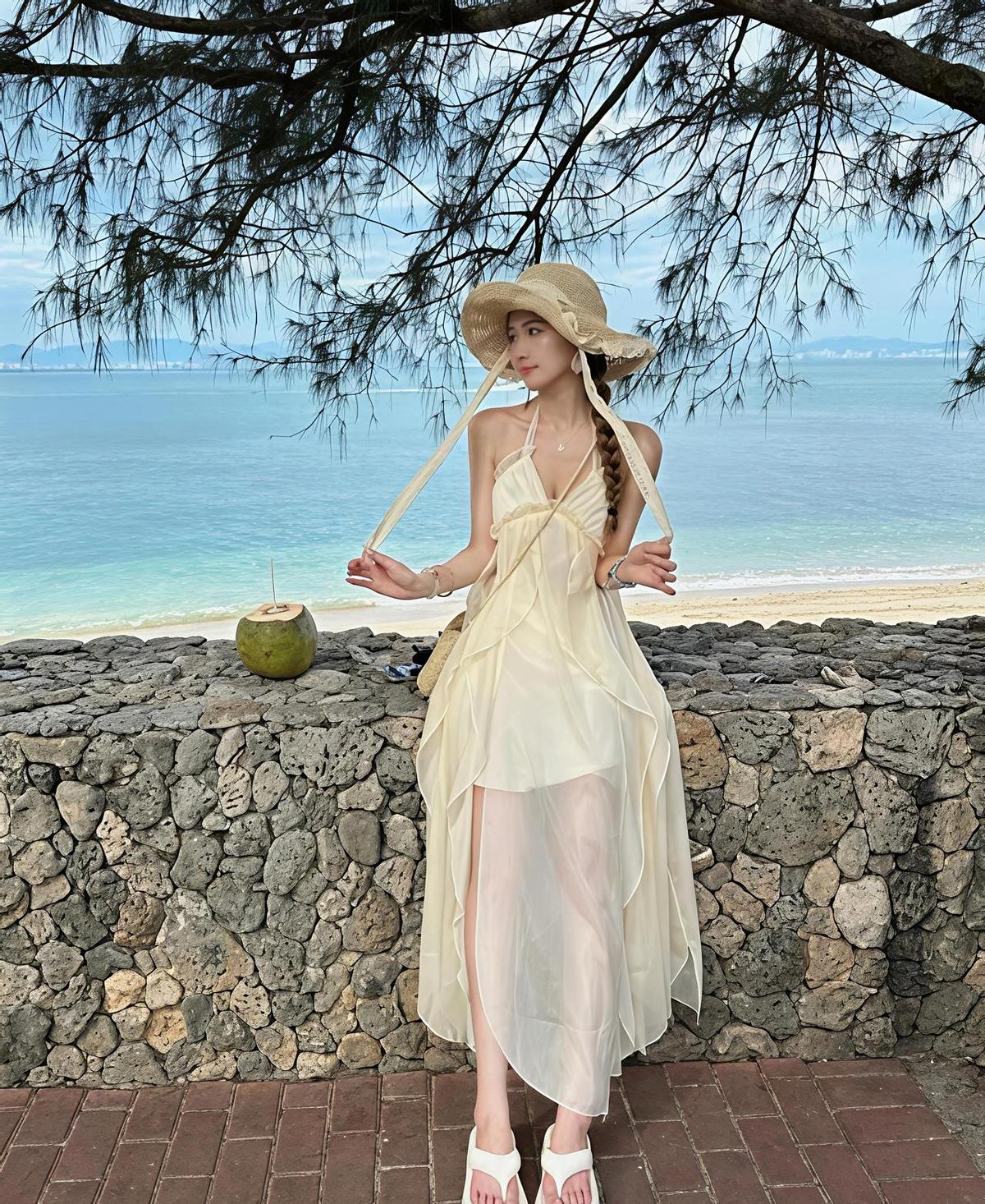 白裙子一穿,海风自动给你打光。 不靠滤镜,靠面料贴着皮肤的那股轻飘感。 前开衩走起来像浪打脚踝,腰间一系带,身材自己会说话。 真丝雪纺不闷汗,草编包一挎,穷也穿出度假的魂。 别穿高跟,沙滩不是T台,脚趾头踩进沙子里才叫放松。 帽子戴歪点,才像真度假,不是来打卡的。 清晨六点的光,能把白裙穿成月光。 你不是在拍照,你是在海里游了一圈,顺手捞了件衣服披上。