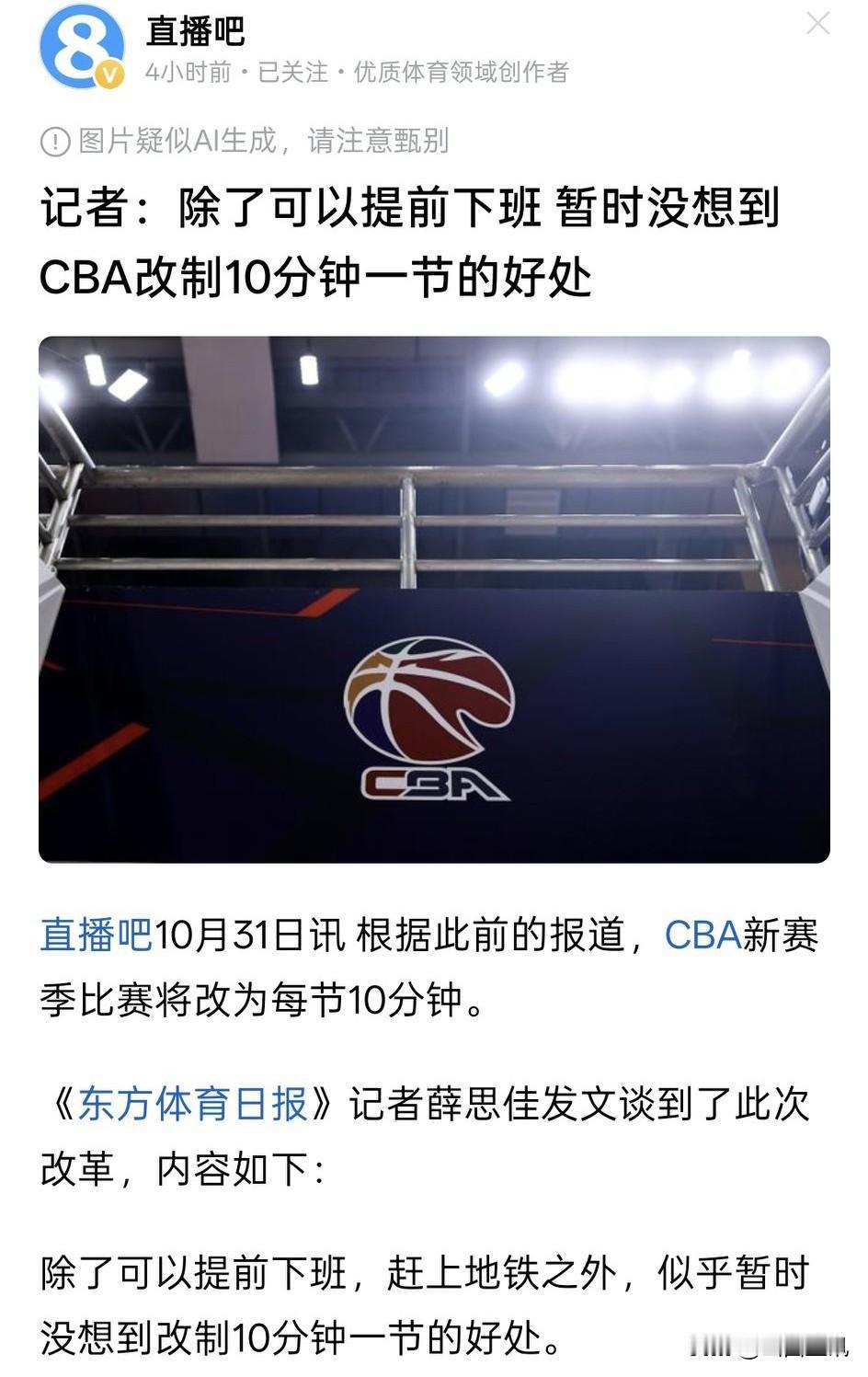 CBA新赛季每节比赛时间改为10分的做法引发新的热议! 众所周知,自CBA成立以来,联盟规定常规时间内每节比赛时间为12分钟,四节比赛即全场比赛时间为48分钟。新赛季CBA联盟将每节12分钟修改为10分钟,也就是每节减少2分钟。就此,媒体记者薛佳思对CBA新赛季单节比赛时间的改革提出质疑。他说,除了可以提前下班赶上地铁外,似乎暂时没有想到改制10分钟一节的好处。有球迷认为至少还有几点好处。如下: 一,球队总经理可以早下班,去“为了快乐而喝酒”,以免出现加时赛后,酒店打烊无处可喝酒! 二,球队向球员支付的工资成本提高了。过去球员要打50多场比赛、每场48分钟比赛,现在只打40多轮,每场少打8分钟。对于球员而言,工时利用率提高了,时间减少了,薪资并不少,可喜可贺! 三,新生代球员的出场机会有可能越来越少了。每队四个外援,外加五个主力球员,然后再有三位替补球员就凑够12人大名单了。因比赛时间减少,为防止对手在第四节翻盘,末节所谓的垃圾时间会越来越少,第二梯队球员的锻炼机会也被将被压缩。这对于新球员来说,可以更早地逼迫他们成为训练魔王,更早地成熟起来,丢掉以赛代练的惰性做法,做到出场就是亮剑,亮剑就能立功!这对于催生球员进步也是好事情!