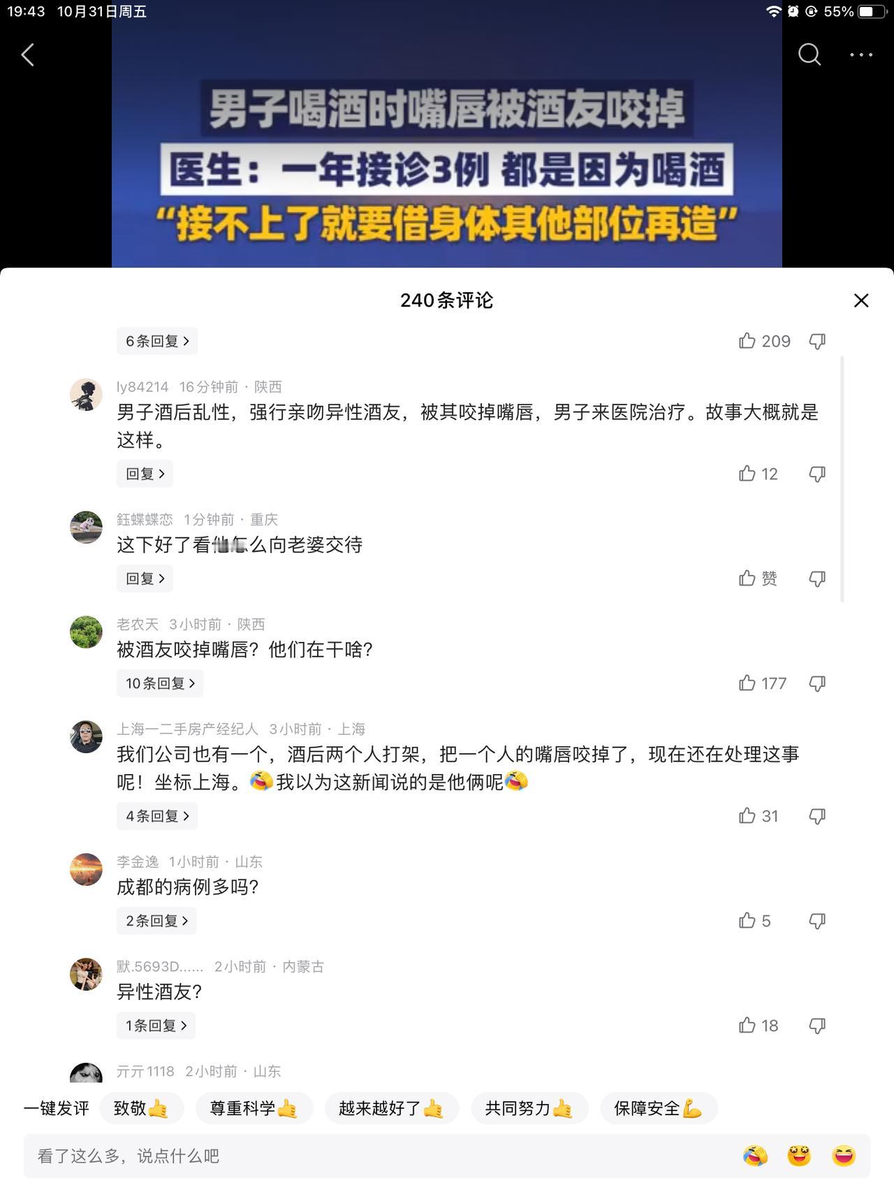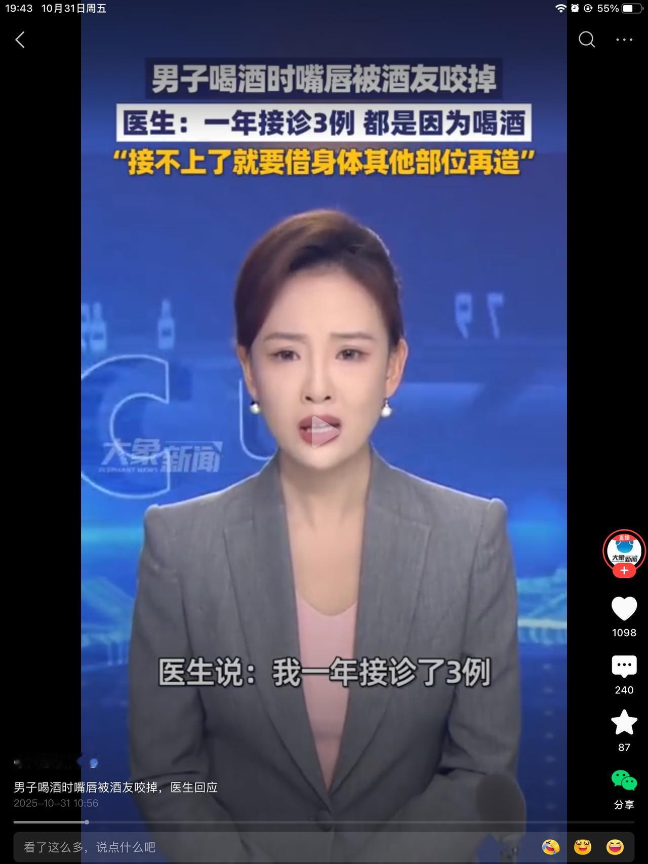 河南一男子喝酒时被酒友咬掉嘴唇。医生表示~一年接诊三例,都是因为喝酒。 视频里没说是因为什么,我猜是强吻了对方,被对方灵机一动,咬掉了下嘴唇。医生同时也表示,可以接上,如果丢了,可以用身体的其他部位再造一个嘴唇。 这个属于医美的范畴,我也知道一点。唇腭裂的孩子,经过治疗,几乎可以达到看不太出来,技术比以前好太多了。咬人的人可以松一口气了,赔点钱大概率就完事儿了。 我以前听说过咬耳朵,泰森都咬过。这把嘴唇咬掉的我还是第一次听说。都是才子。卧龙凤雏。