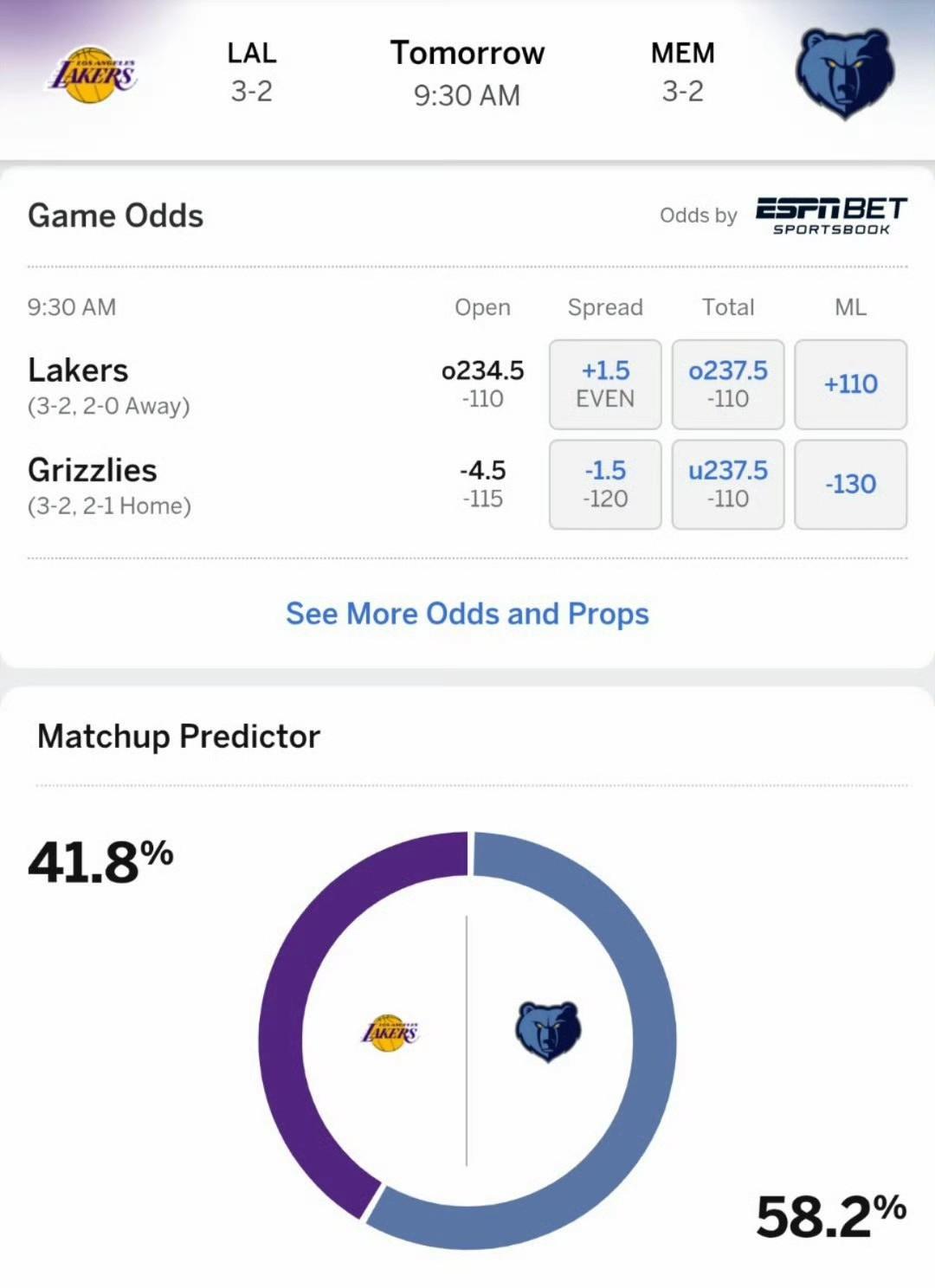 我不会再相信所谓的胜率预测了。ESPN预测明日湖人vs灰熊胜率:湖人41.8%,灰熊58.2%。 东契奇斯玛特已上升为出战成疑。为什么湖人的胜率比灰熊低?