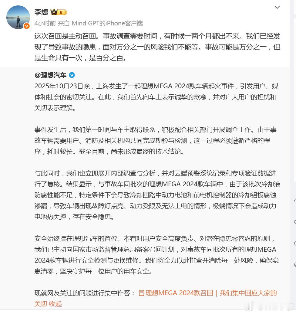 现在是理想汽车内部排查出来了同批次的理想MEGA 2024款车的安全隐患:该批次冷却液防腐性能不足,特定条件下会导致冷却回路中动力电池和前电机控制器的冷却铝板腐蚀渗漏,导致车辆出现故障灯点亮、动力受限及无法上电的情形,极端情况下会造成动力电池热失控,存在安全隐患。