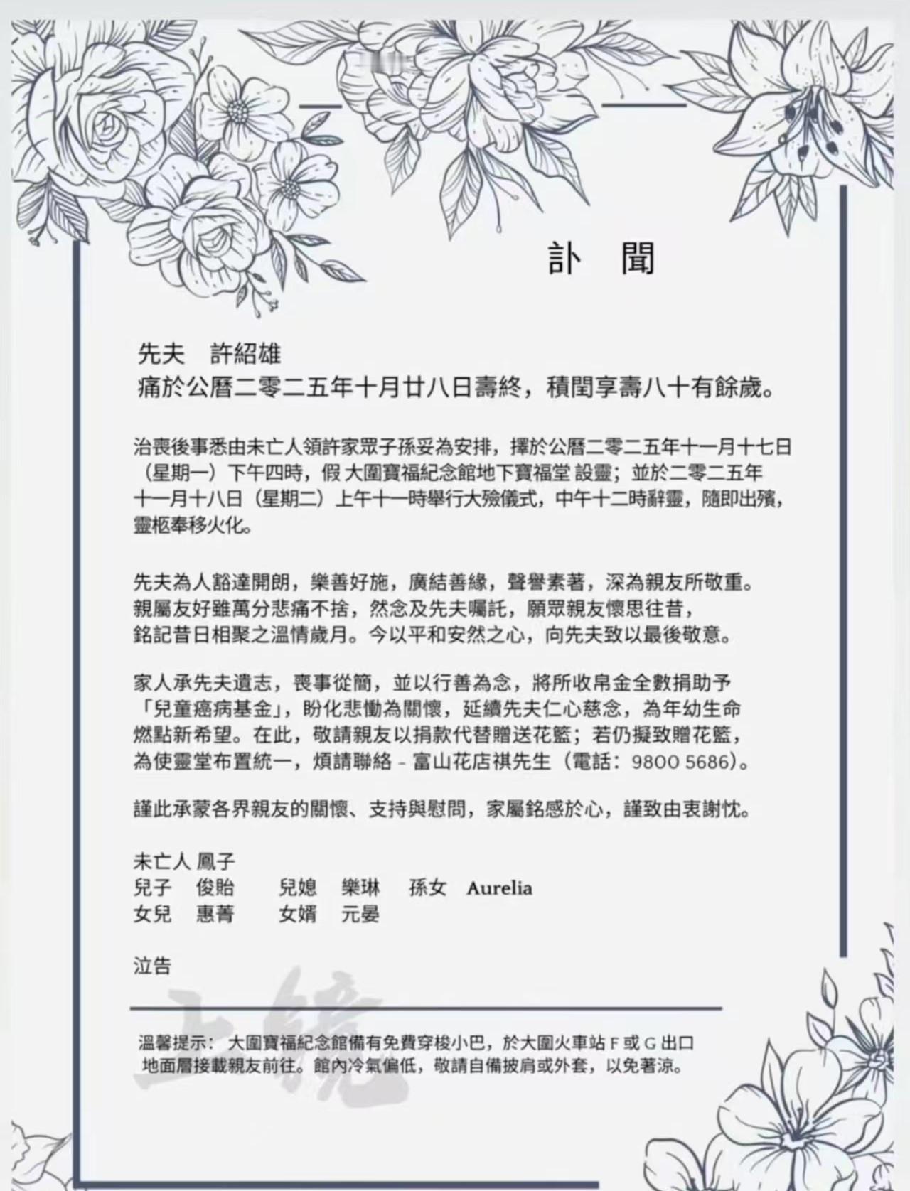 许绍雄儿女发出讣告,公布了出殡日期,是在11月17日。讣告上有一句话很奇怪,说许绍雄“享寿八十有余岁”,但实际上许绍雄是76岁去世的,为什么儿女还会说他享寿八十有余岁呢? 一种解释是出于尊敬,后人会将接近八十岁去世的老人的年纪添上几岁,从而变成享年八十有余。许绍雄76岁去世,虚岁可以算到78,只需要加两岁就够80了,倒也不算夸张。 另一种解释是享寿八十有余,指的是寿命不足八十,但是差不了几岁,这倒是符合许绍雄年纪的。 还有一种解释是去世的老人“天加一岁”,“地加一岁”,这样许绍雄以78虚岁去世,加上天地两岁,正好也是80岁。 当然也有可能是广东香港那样的特殊习俗,毕竟许绍雄祖籍广东,又长居香港。 以上几种解释,不知道哪一种才是对的呢?知道的朋友可以说一说。