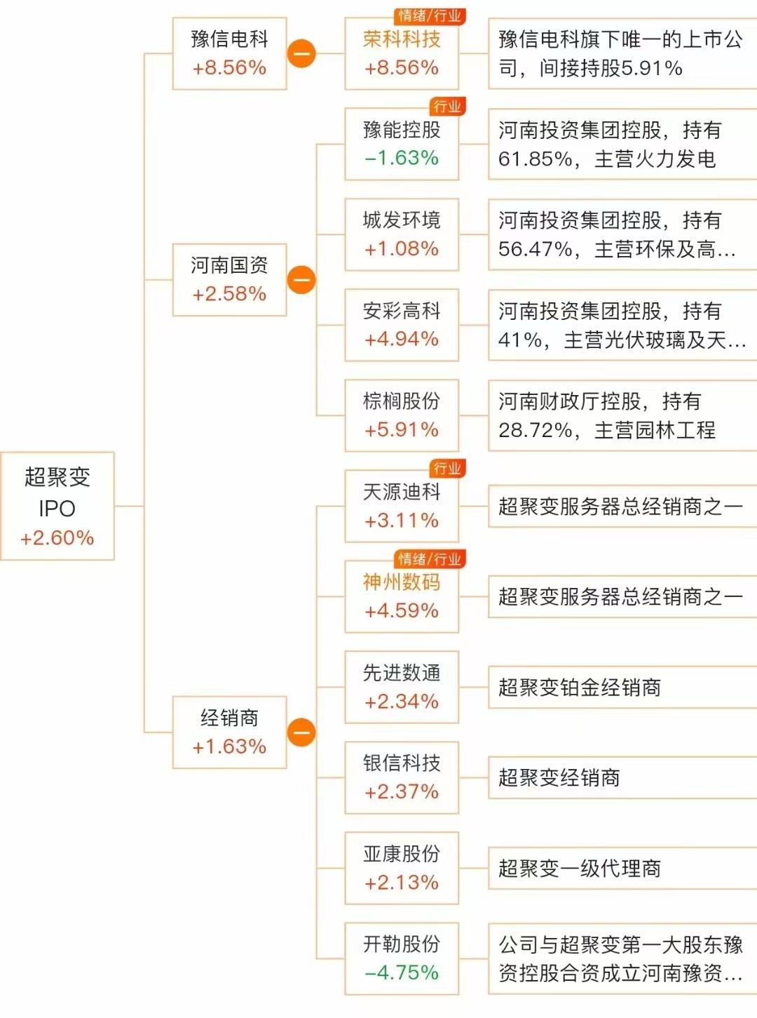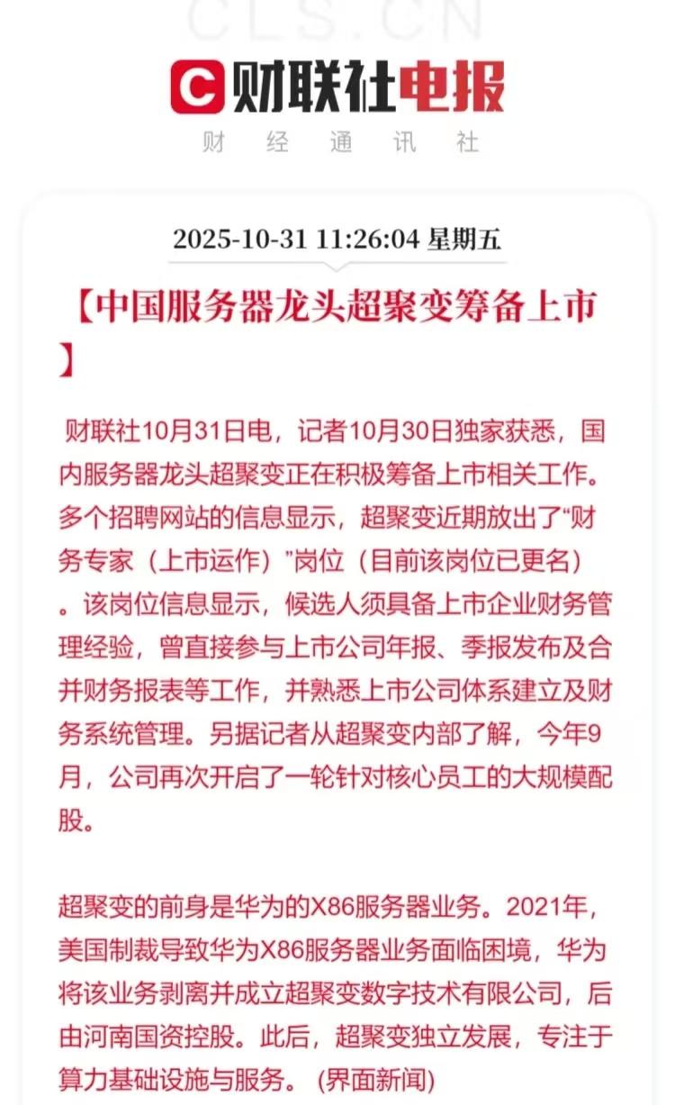 重磅,10月31日消息,中国服务器龙头超聚变正在筹备上市。相关概念龙头代表有哪些? 超聚变曾是华为的全资子公司,后从华为剥离独立,2024年3月,华为将超聚变列为战略级合作伙伴。超聚变是国内服务器领域的龙头企业,其前身是华为X86服务器业务。剥离后由河南国资控股,在国产服务器、算力硬件供应等赛道具备较强的技术积累与市场影响力,是国内算力基建产业链中的核心参与者之一。 超聚变概念龙头代表梳理! 荣科科技:超聚变关联上市平台。 天源迪科:超聚变服务器总代。 亚康股份:算力服务合作伙伴。 华胜天成:超聚变核心合作伙伴。 理财有风险入市需谨慎!