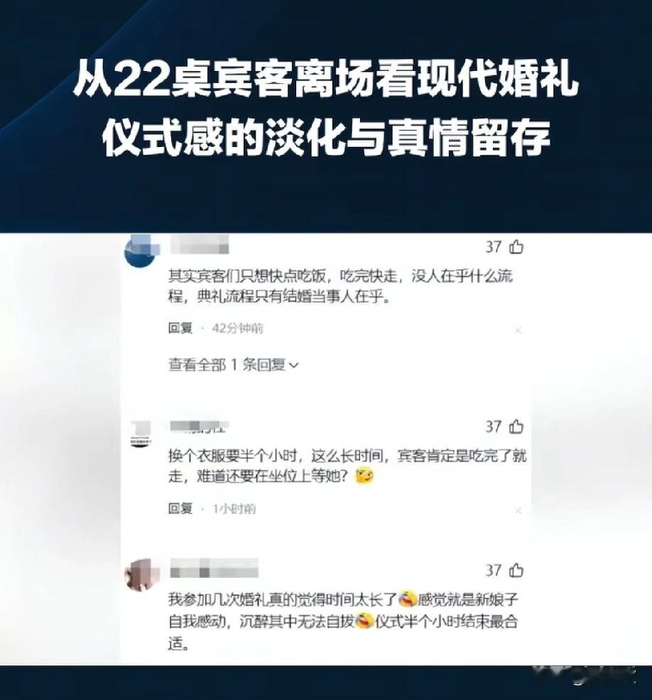 遵义婚宴22桌宾客全走光! 婚礼翻车能有多猝不及防? 遵义一场婚宴直接给所有新人上了一课!22桌宾客吃到一半全提前离场, 新郎新娘傻眼之余, 真别怨宾客不给面子, 问题根源其实在新娘自己身上。 谁不想婚礼上美出天际? 可再美的造型也得给时间让路! 这位新娘换敬酒服足足花了30分钟, 要知道饭点的饭局就像赶高铁, 大家节奏都快,没人会抱着“等新娘”的心态耗着。 宾客们见迟迟没人敬酒, 还以为环节取消, 吃饱喝足自然就散了, 等新娘美美的出来, 只剩空荡荡的大厅。 一辈子一次的婚礼,精致没错, 但“拎不清重点”就错了! 婚礼筹备不是只拼颜值, 时间把控才是隐形关键。 快节奏时代,没人愿意为无意义的等待买单,新娘的疏忽看似小事, 实则暴露了筹备时的考虑不周, 这锅真不能甩给宾客。 婚礼上你更看重颜值精致还是流程顺畅?如果是你,会怎么避免这种尴尬?
