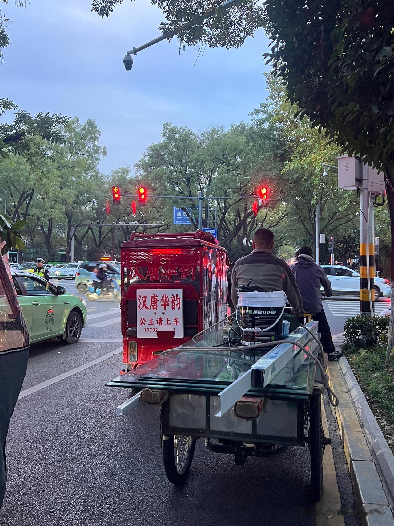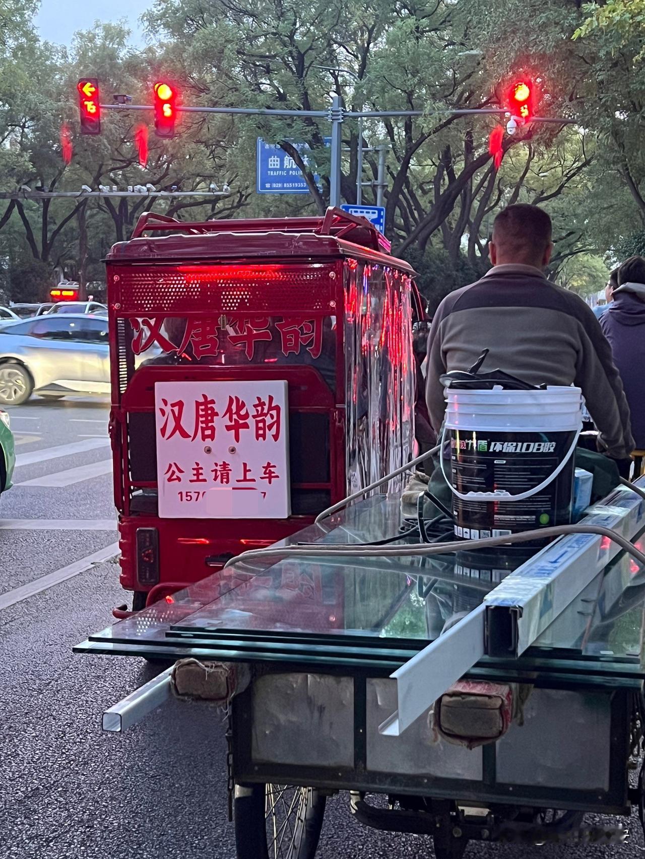 大家发现了没有, 在西安这种三轮车🛺, 特别是穿梭于钟楼与大雁塔之间的, 西安本地人是不会坐的, 坐这个三轮车的大部分是外地游客, 在具体一点,绝大部分 是穿着一身汉服, 辗转钟楼与大雁塔在网红打卡点 拍照的小仙女。 所以,雁塔北路往大雁塔方向就 偶遇了这辆有特色的三轮车🛺, 特别是车身后面那句标语!