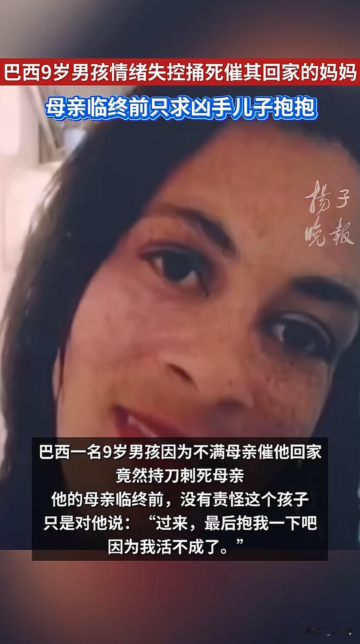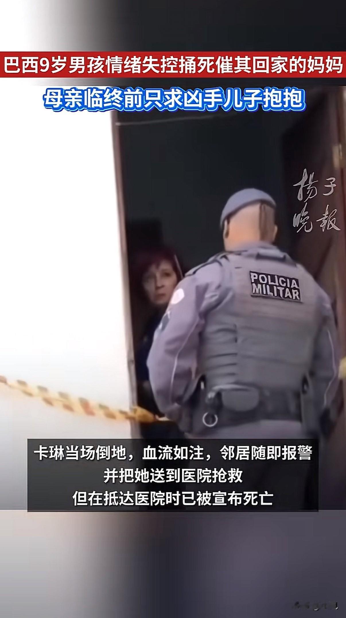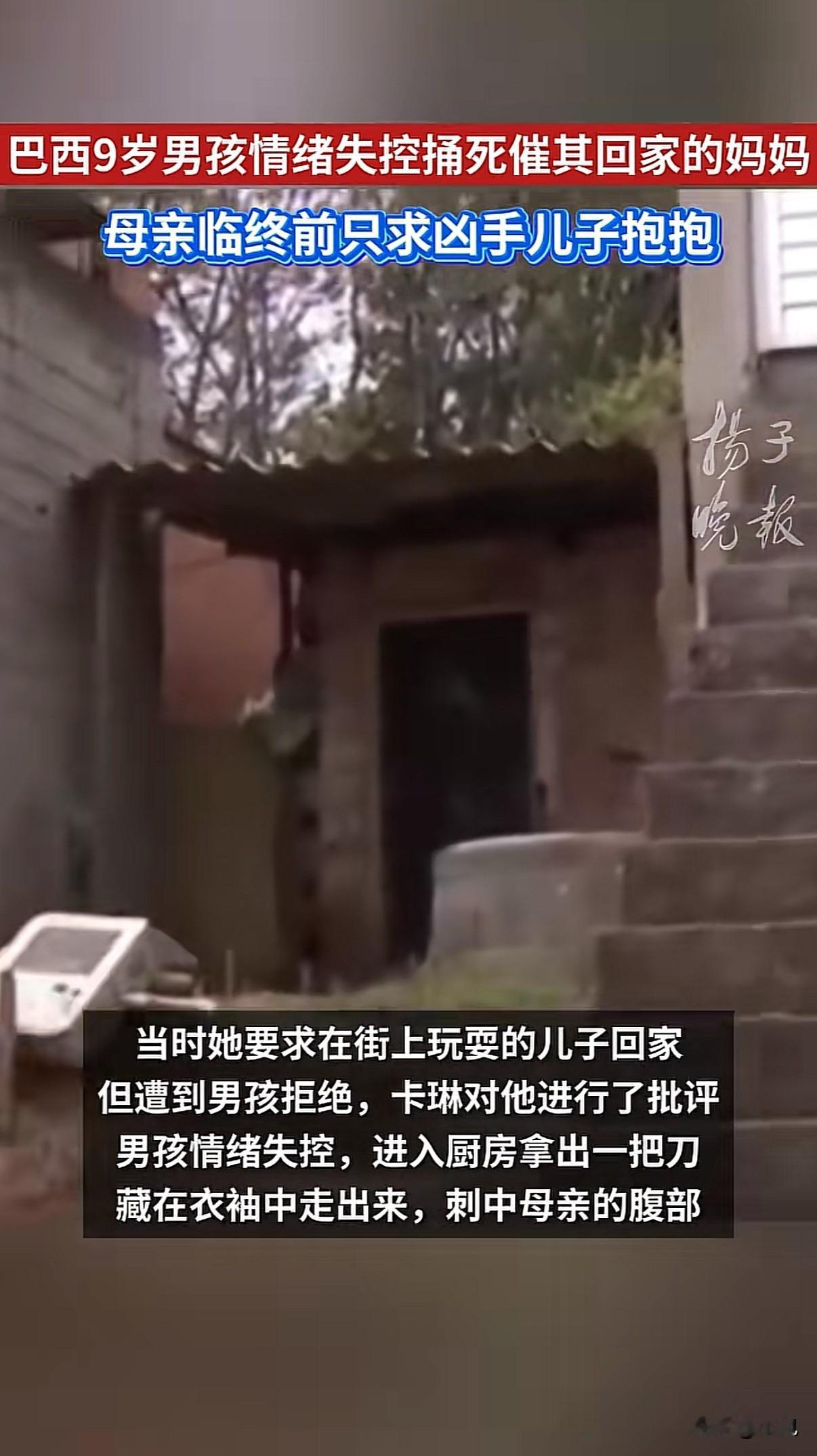 一个9岁男孩,因为妈妈催他回家,从厨房拿刀刺向母亲。最让人难受的是母亲最后那句话:"过来,最后抱我一下吧,因为我活不成了。" 这个男孩不是突然变这样的。他哥哥说,弟弟平时就脾气暴躁,被批评时会攻击人。这不是第一次失控,只是这次后果太惨重。 据邻居回忆,那天下午,卡琳看到儿子在街上玩得太晚,喊他回家。男孩不肯,卡琳多说了几句。谁也没想到,孩子冲进厨房,选了把刀藏在袖子里,出来就捅向母亲腹部。 血立刻涌出来,邻居赶紧报警送医。但一切都来不及了。 根据巴西法律,12岁以下儿童不能被起诉。男孩现在由亲戚照顾,警方甚至没带他去警局。 这个结果引发很多讨论。法律保护了未成年人的权益,但面对如此极端的暴力行为,社会该如何应对? 有儿童心理专家分析,一个9岁孩子做出这种行为,通常不是突然的。之前肯定有过多次警告信号——比如哥哥提到的攻击倾向。这些信号被忽略了,或者说,家人不知道该怎么处理。 母亲卡琳是单亲妈妈,经营着小店。可能忙于生计,可能缺乏相关知识。她独自抚养两个儿子,大儿子19岁,已经成年。 那个最后的拥抱让人深思。这不是电视剧,是真实发生的。一个母亲在生命尽头,对杀死自己的儿子,选择的不是愤怒,而是原谅。 这种爱很伟大,但也让人反思:无条件的爱,到底该有什么界限? 类似的事件不是第一次发生。去年有个13岁女孩,因为手机被没收而离家出走。虽然没造成生命危险,但根源相似——孩子无法处理挫折,用极端方式表达愤怒。 这些孩子在发出求救信号,只是我们用成人的眼睛没看懂。 事情发生在巴西圣保罗的帕雷里鲁斯社区。一个普通家庭,一个平常的傍晚,一次普通的催促回家,却以最惨烈的方式收场。 现在男孩和哥哥由亲戚照顾。失去妻子的父亲,失去母亲的孩子,这个家已经碎了。 法律无法追究9岁孩子的刑事责任,但心理的创伤会跟随他一辈子。那个最后的拥抱,可能成为他一生都无法摆脱的记忆。 这件事给我们提了个醒:孩子的情绪问题,不能简单归为"不听话"或"还小"。需要专业干预,需要社会支持系统。 你觉得,面对这种情况,除了法律,我们还能做些什么?