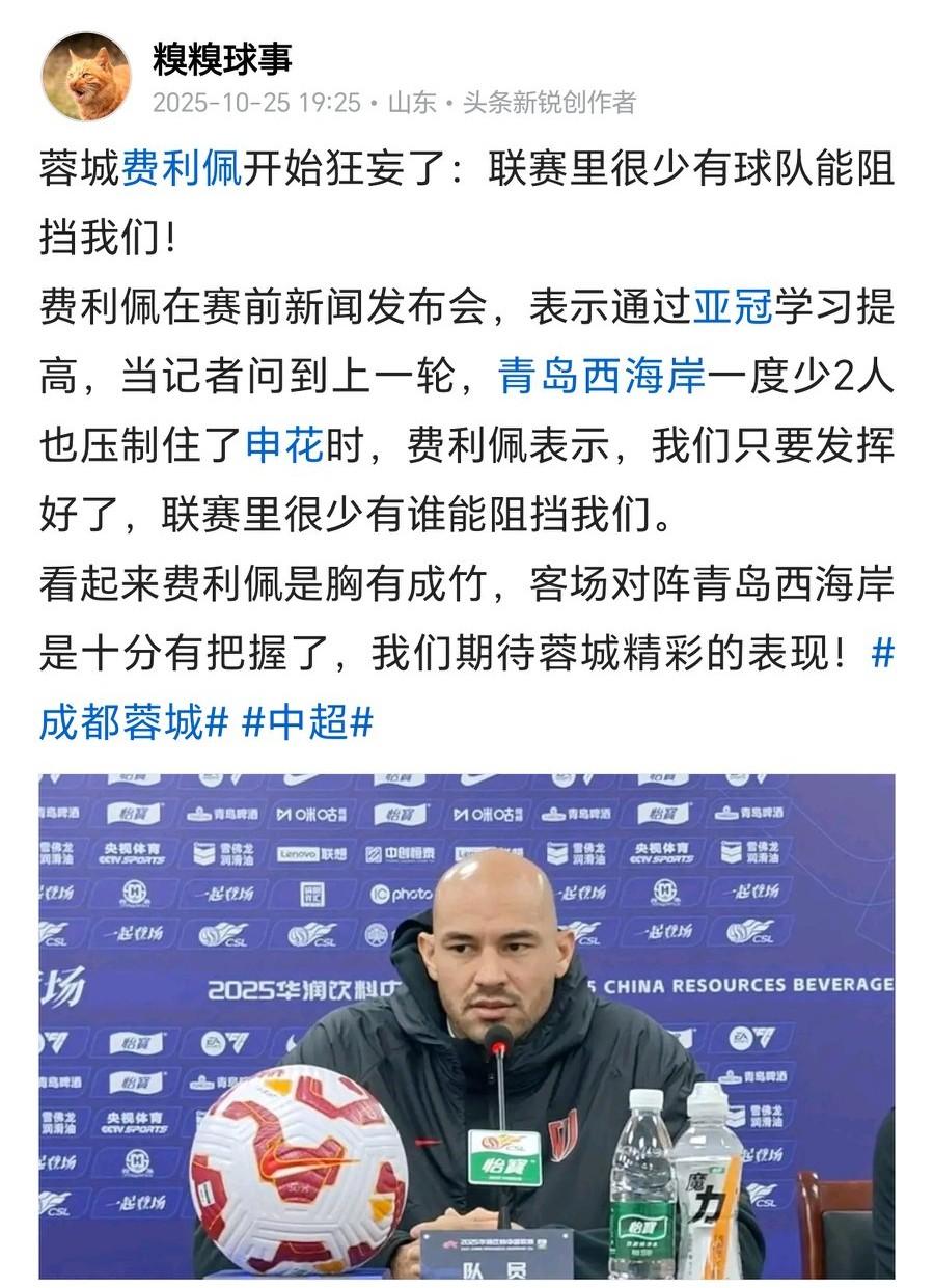 之前我说,球迷可以说大话,但是主教练、球员千万别说,这次在成都蓉城和费利佩身上应验了! 对阵青岛西海岸赛前新闻发布会,费利佩说:我们通过亚冠学习提高,联赛里很少有人能阻挡我们! 当时我说费利佩有些狂妄了,有些人还指责我,事实呢?1平1负,连丢5分,提前一轮彻底无缘冠军,早知道在上一轮山东泰山3-0上海海港后,成都蓉城是有望登顶的,夺冠指数是飙升的。所以有时候有些话不能乱说,玄学很灵验的。成都蓉城